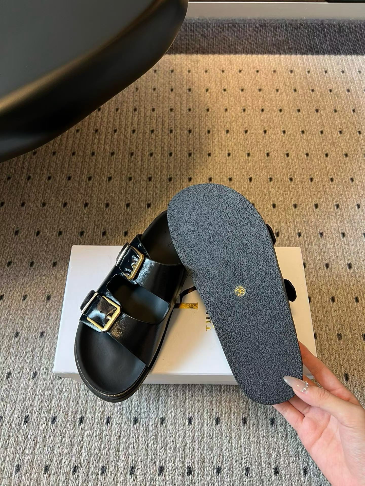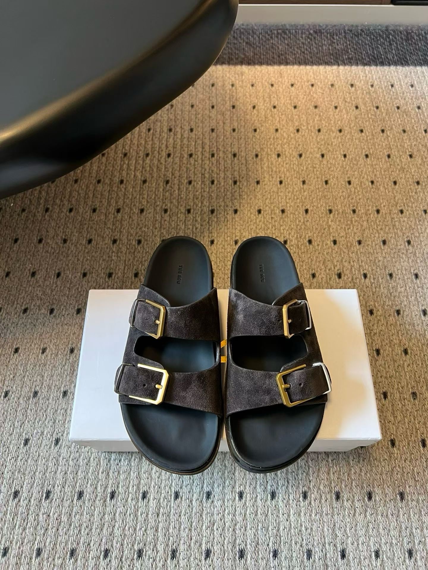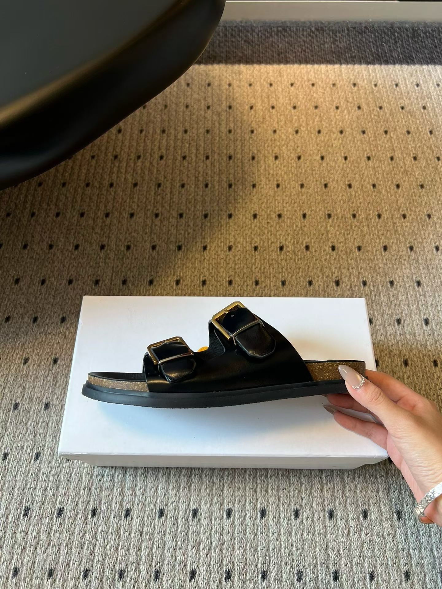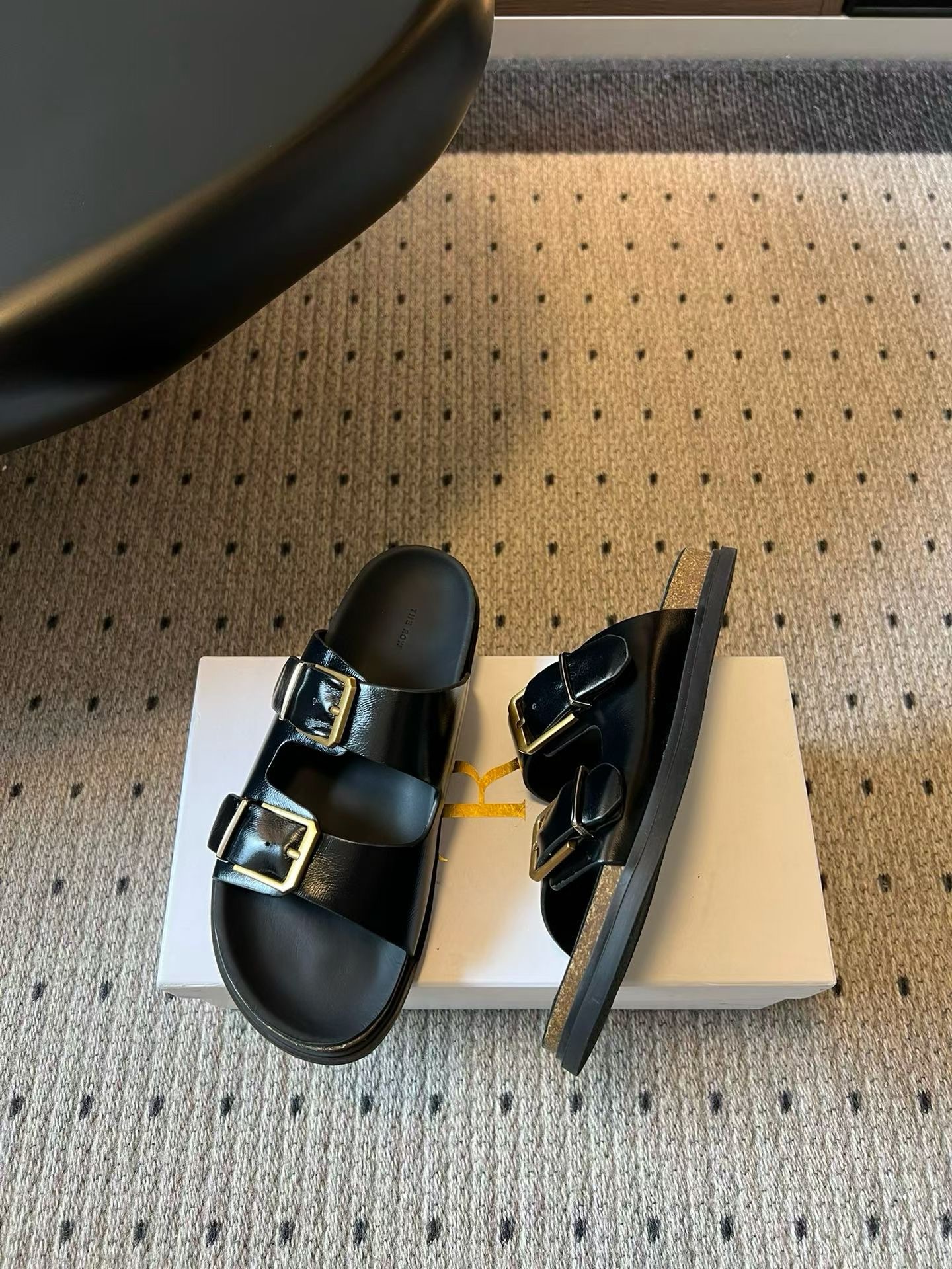 최고퀄리티 제품입니다. THE ROW26SS 더블 골드 버클 레트로 캐주얼 샌들 윗부분: 소가죽 네린: 양가죽 아웃솔: 고무 아웃솔 크기: 35-40 사이즈 (40 제작) 뒤꿈치 높이: 2cm 색상:사진 참조