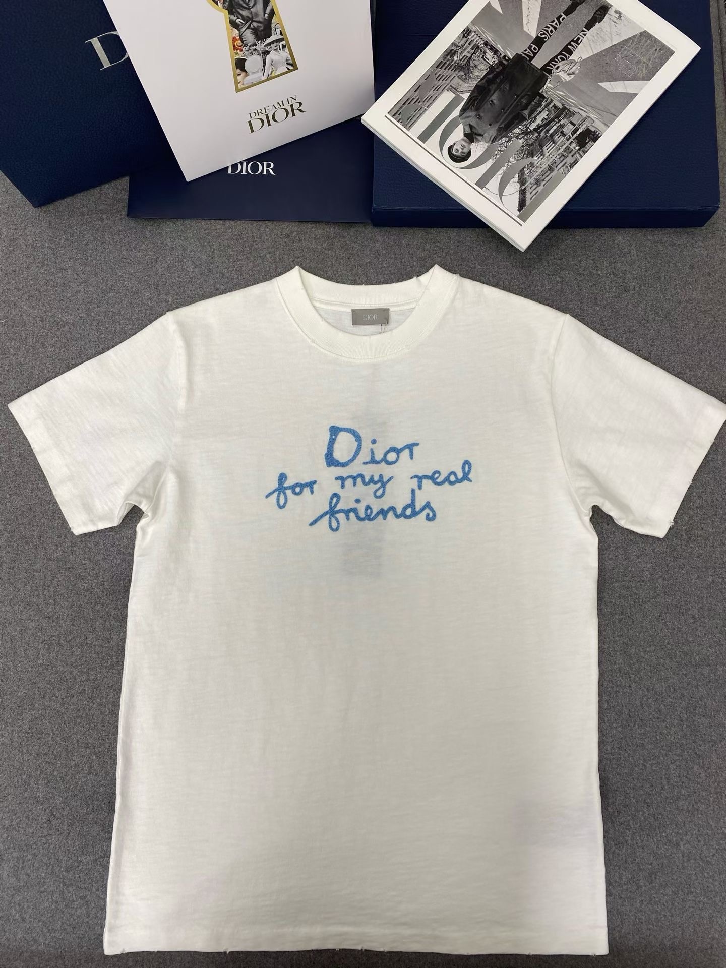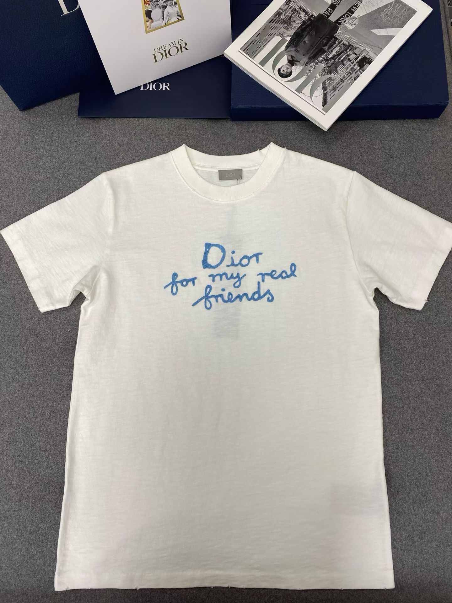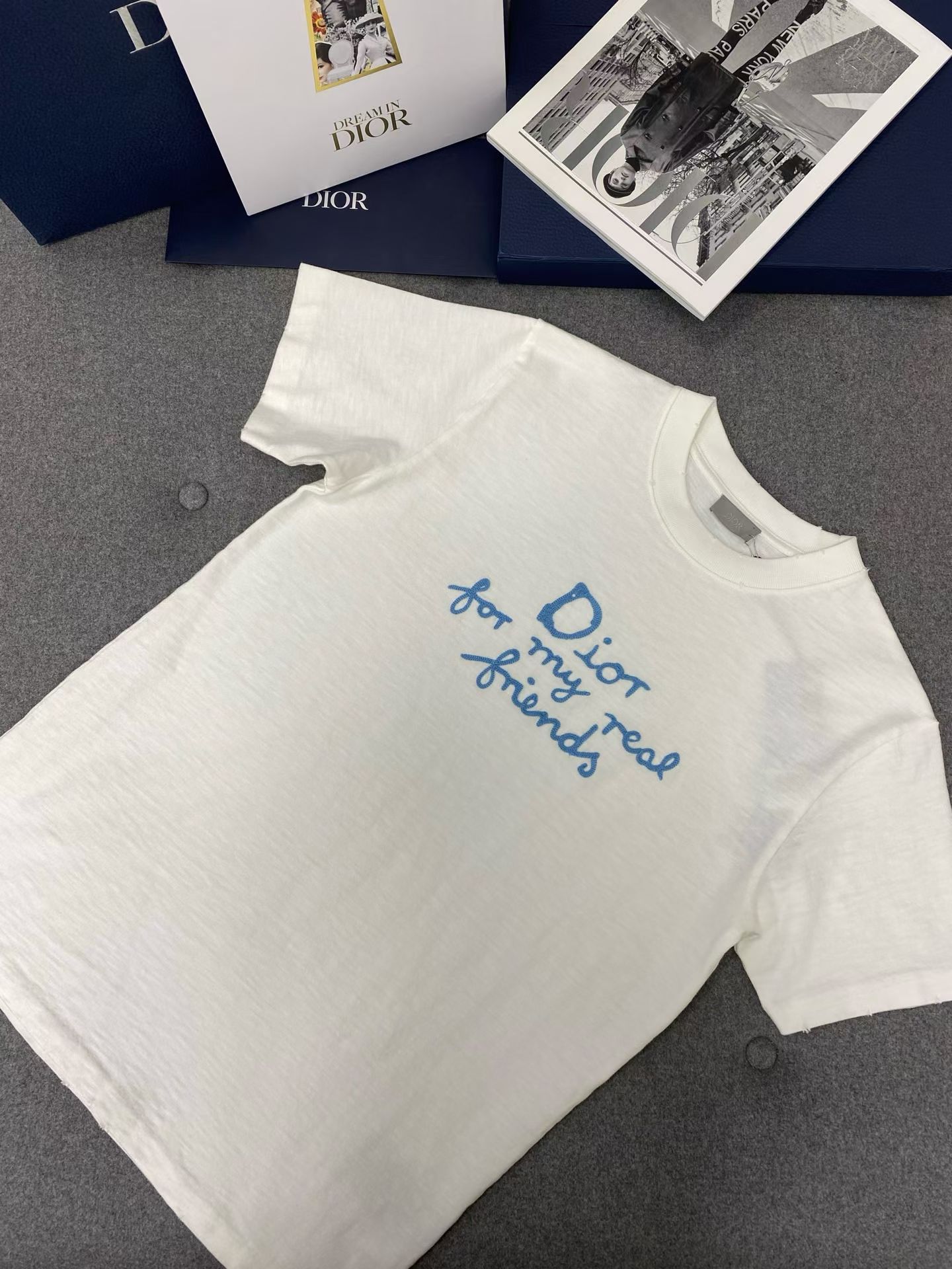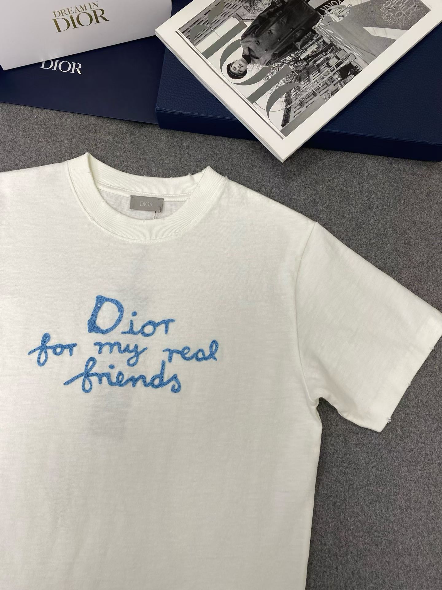 디올 면 티셔츠 대나무 원단이에요! 굉장히 가볍고 부드럽기가 비교할수 없으며 시원한 소재입니다 이니셜은 자수를 일일히 스티칭하여 입체감이 있어요. 사이즈: S M L XL