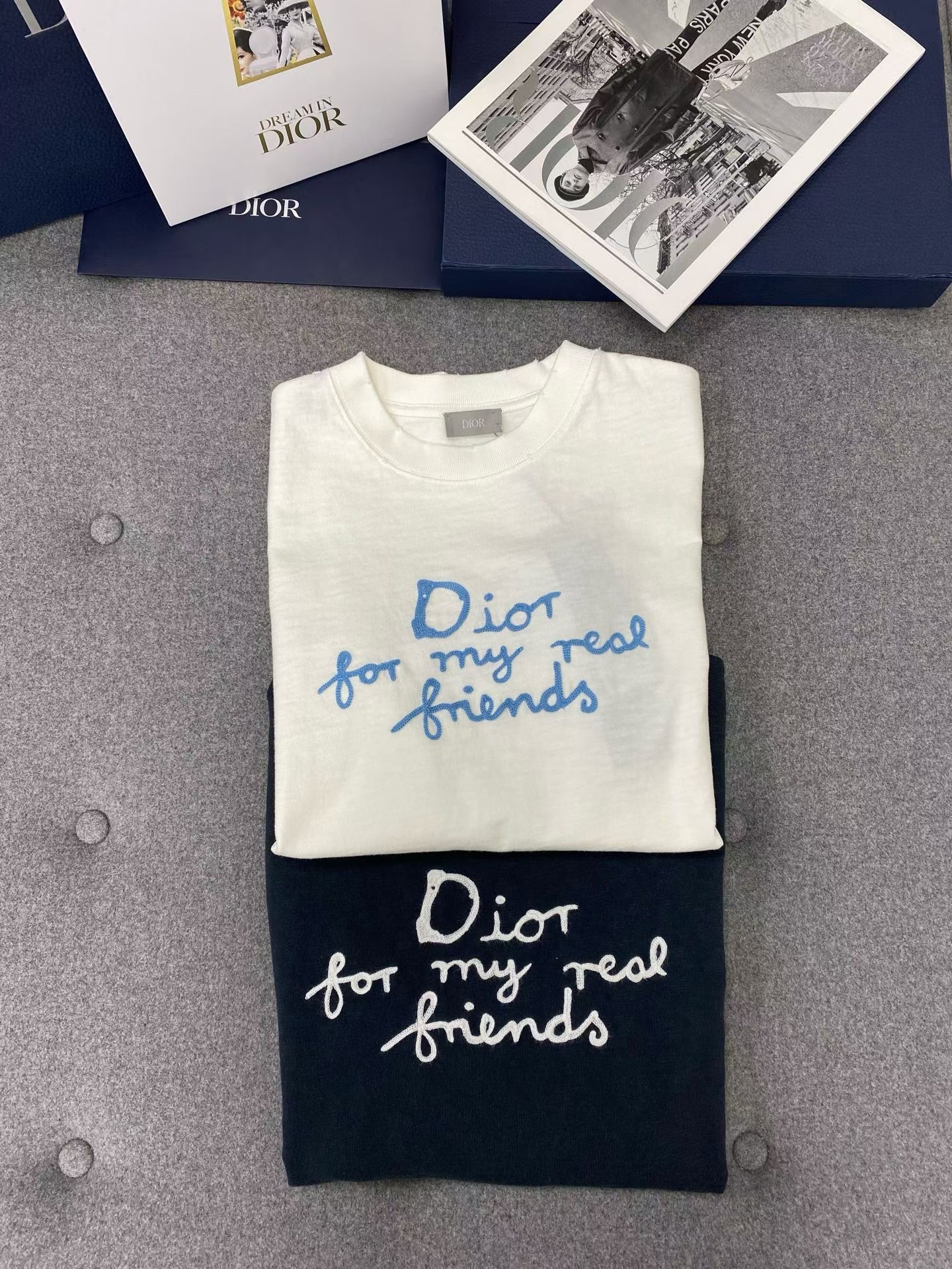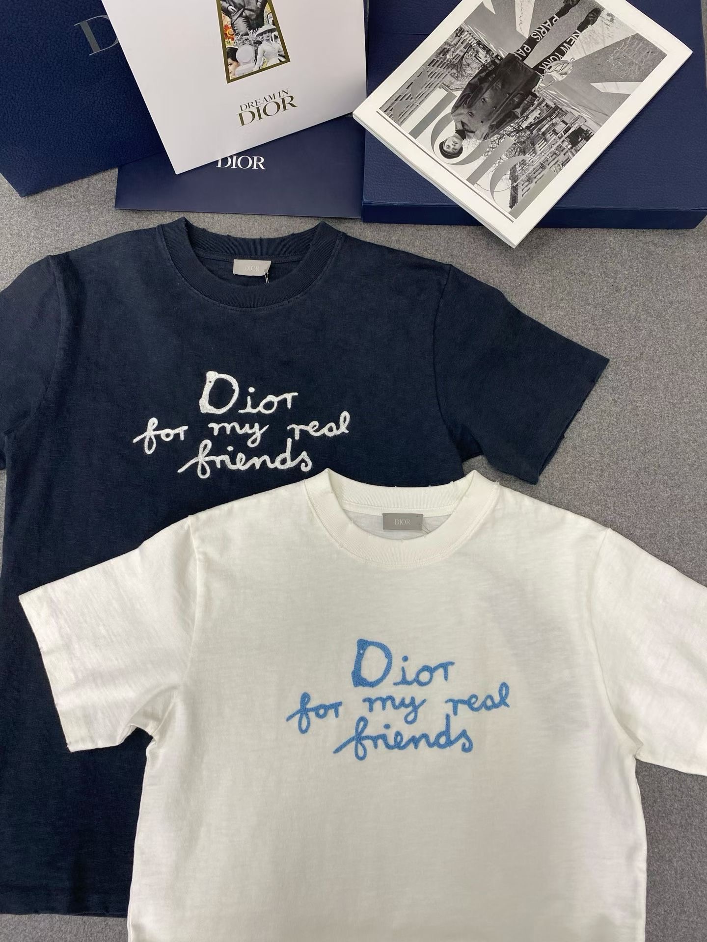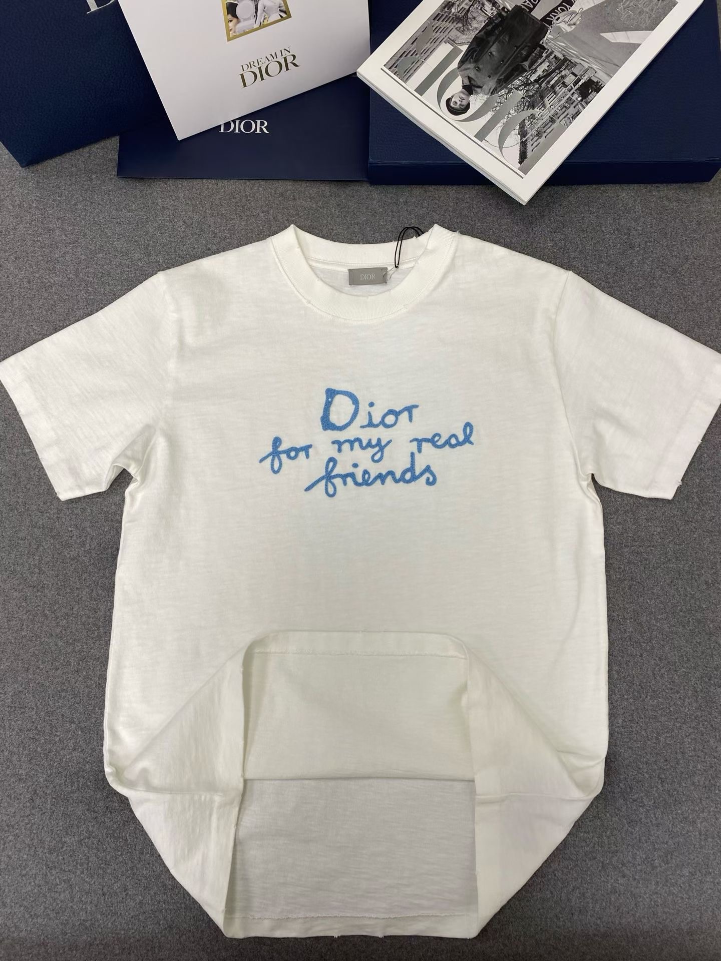 디올 면 티셔츠 대나무 원단이에요! 굉장히 가볍고 부드럽기가 비교할수 없으며 시원한 소재입니다 이니셜은 자수를 일일히 스티칭하여 입체감이 있어요. 사이즈: S M L XL