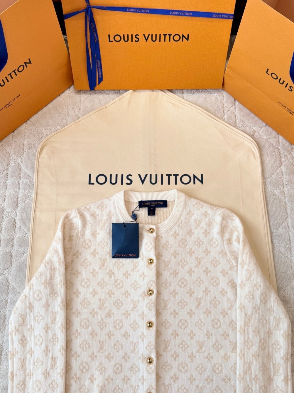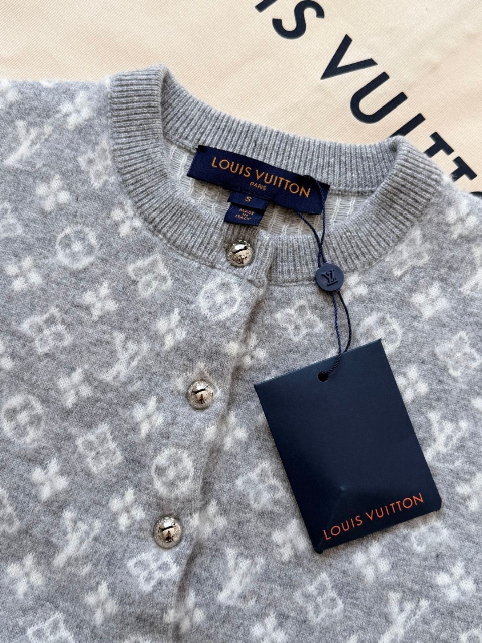모노그램 패턴이 은은하게 들어가 있고 금장 단추가 포인트입니다.