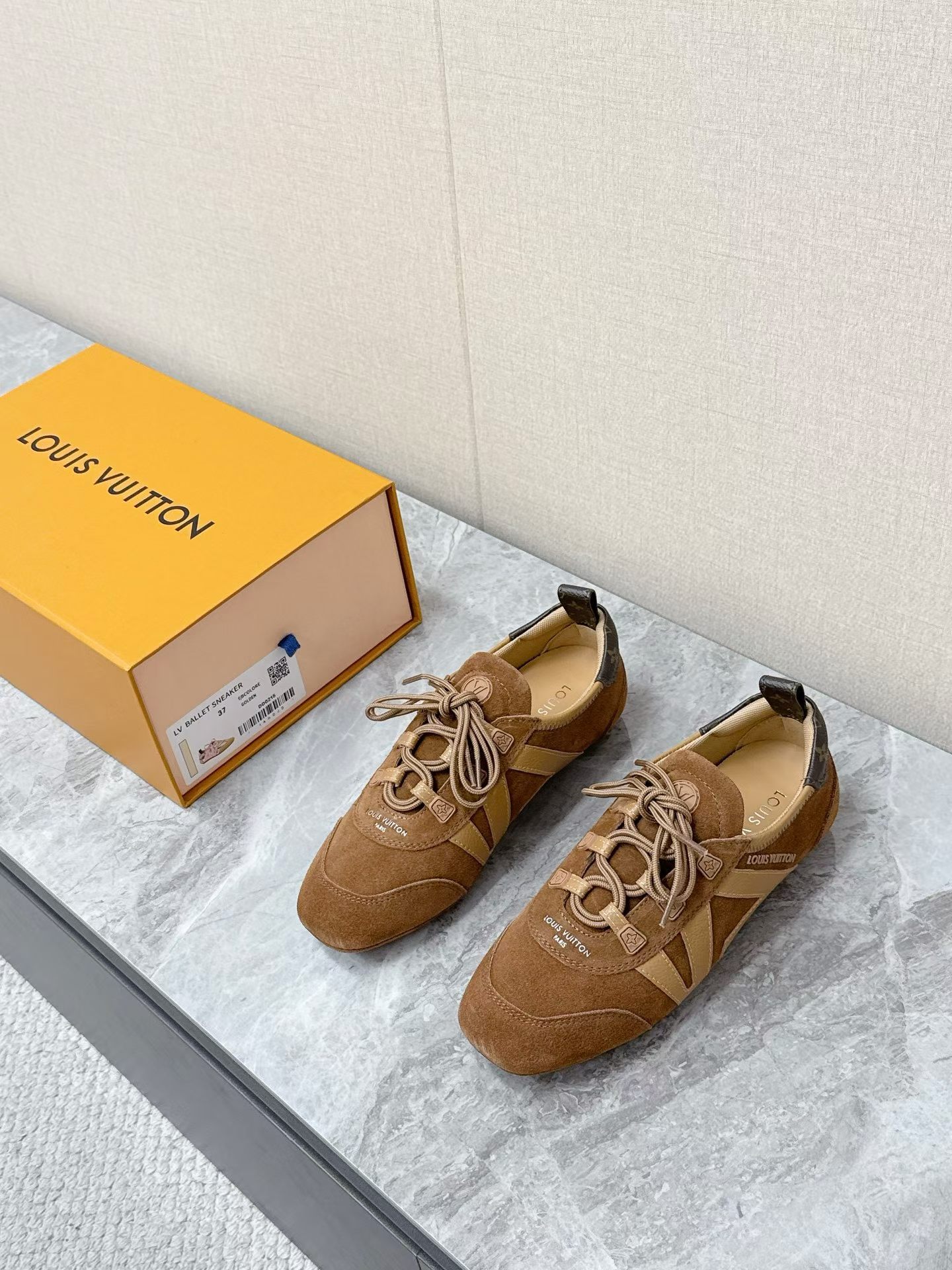 스니커리나 발레 스타일 스니커즈는 실크 스웨이드 카우하이드로 만들어져 부드러운 라인을 만들어 발레 슈즈의 가벼운 디자인과 편안한 스니커즈 질감을 결합했습니다.