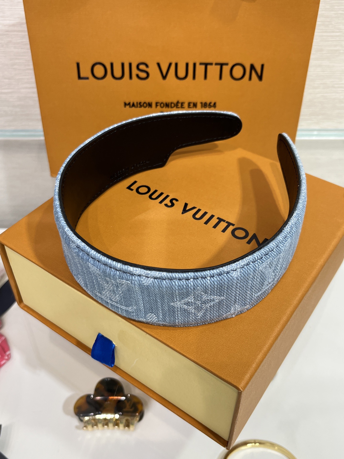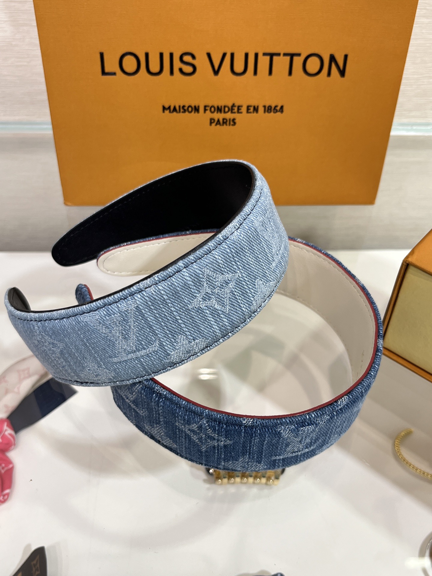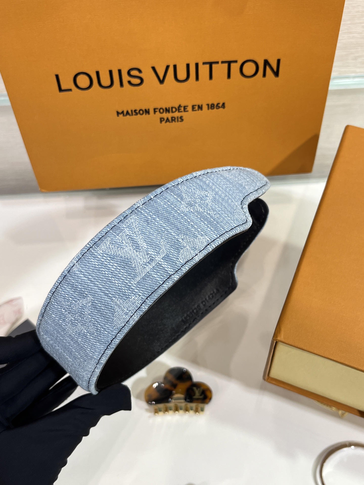 헤어스타일을 완벽하게 고정해 주는 스타일리시하면서도 실용적인 데님 헤드밴드.