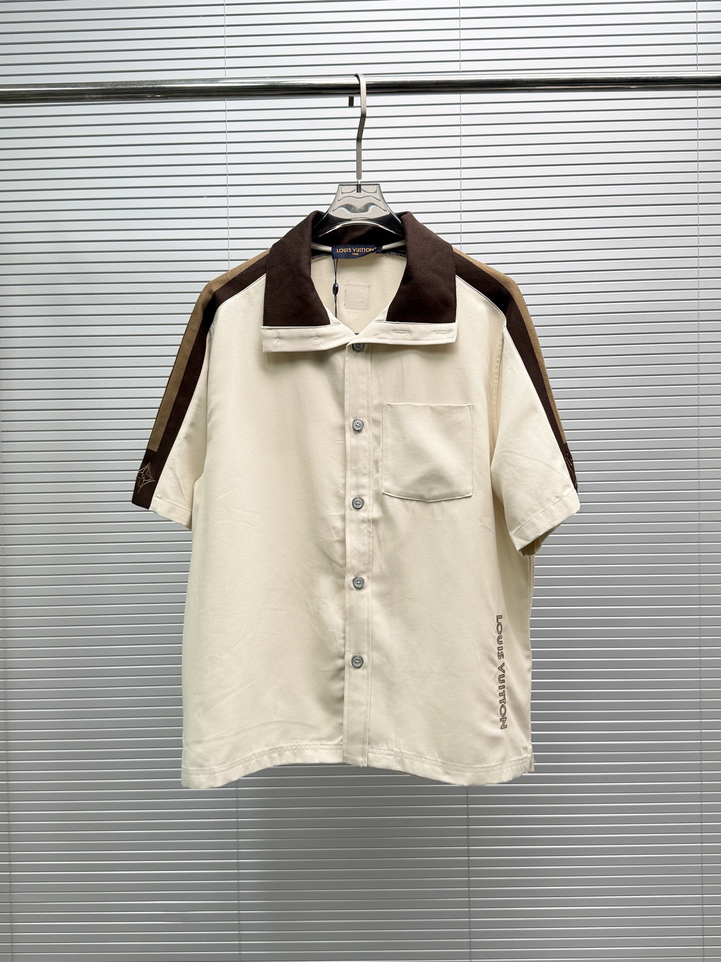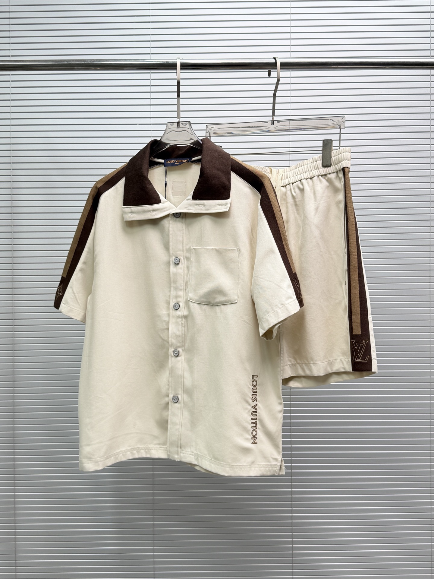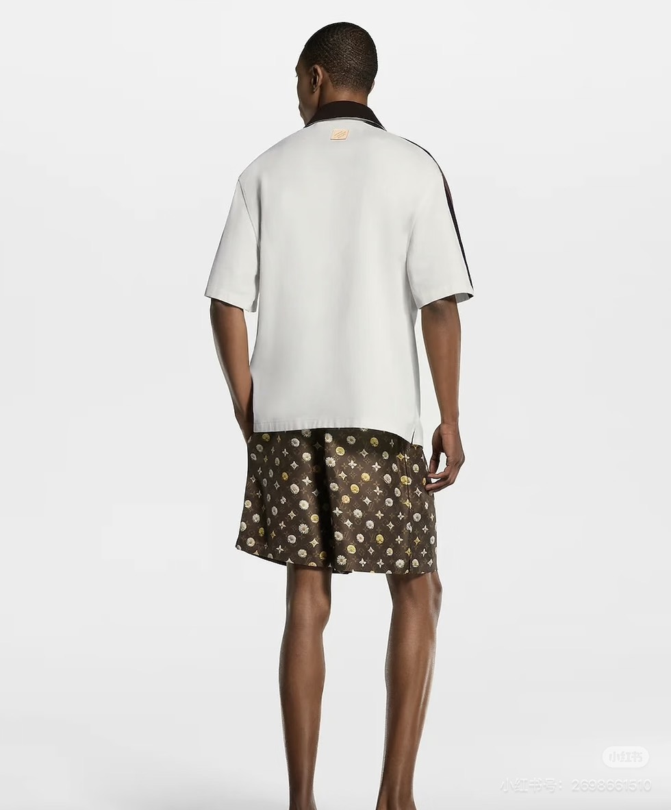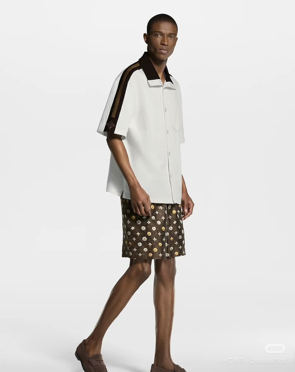 LV*2026SS 반팔티셔츠+반바지 프리미엄 매장판 다크 브라운 골지 장식이 반팔 화이트 피케에 도형적인 포인트를 주었습니다. 시그니처 자수 스트랩이 어깨와 소매에 포인트를 주었으며 브라운 컬러는 터틀넥처럼 여밈이 가능하며 오픈하여 착용할 수 있습니다. 왼쪽 가슴에 새겨진 자수 루이비통 글씨로 스포티한 분위기를 더했습니다. 원단의 자유로움이 스타일링 하기 좋습니다.
