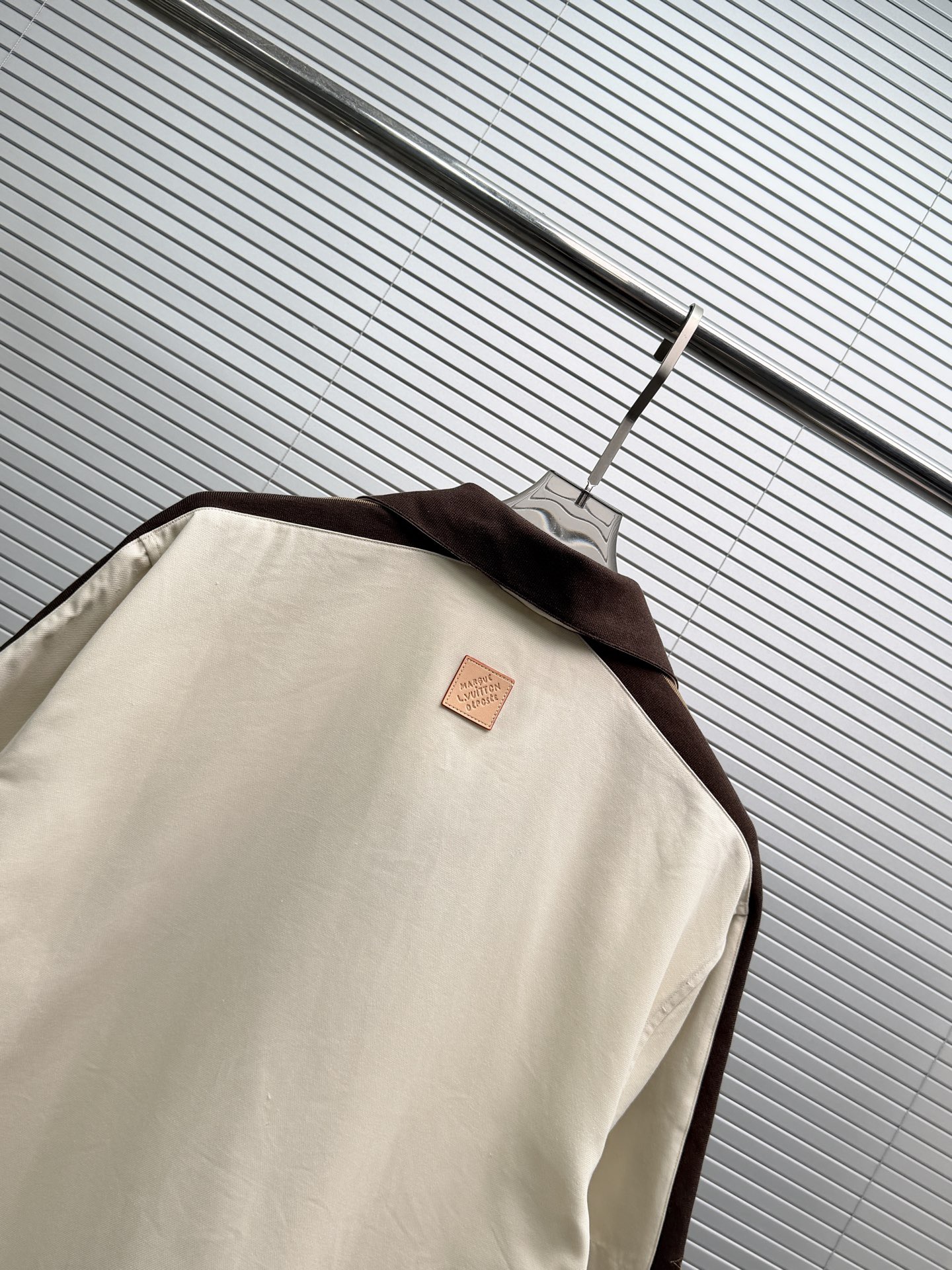 다크 브라운 골지 장식이 반팔 화이트 피케에 도형적인 포인트를 주었습니다. 시그니처 자수 스트랩이 어깨와 소매에 포인트를 주었으며 브라운 컬러는 터틀넥처럼 여밈이 가능하며 오픈하여 착용할 수 있습니다. 왼쪽 가슴에 새겨진 자수 루이비통 글씨로 스포티한 분위기를 더했습니다.