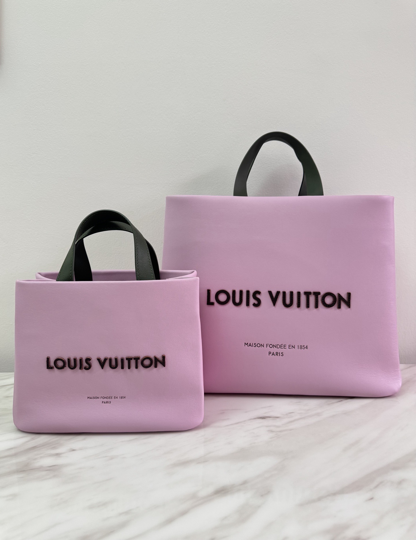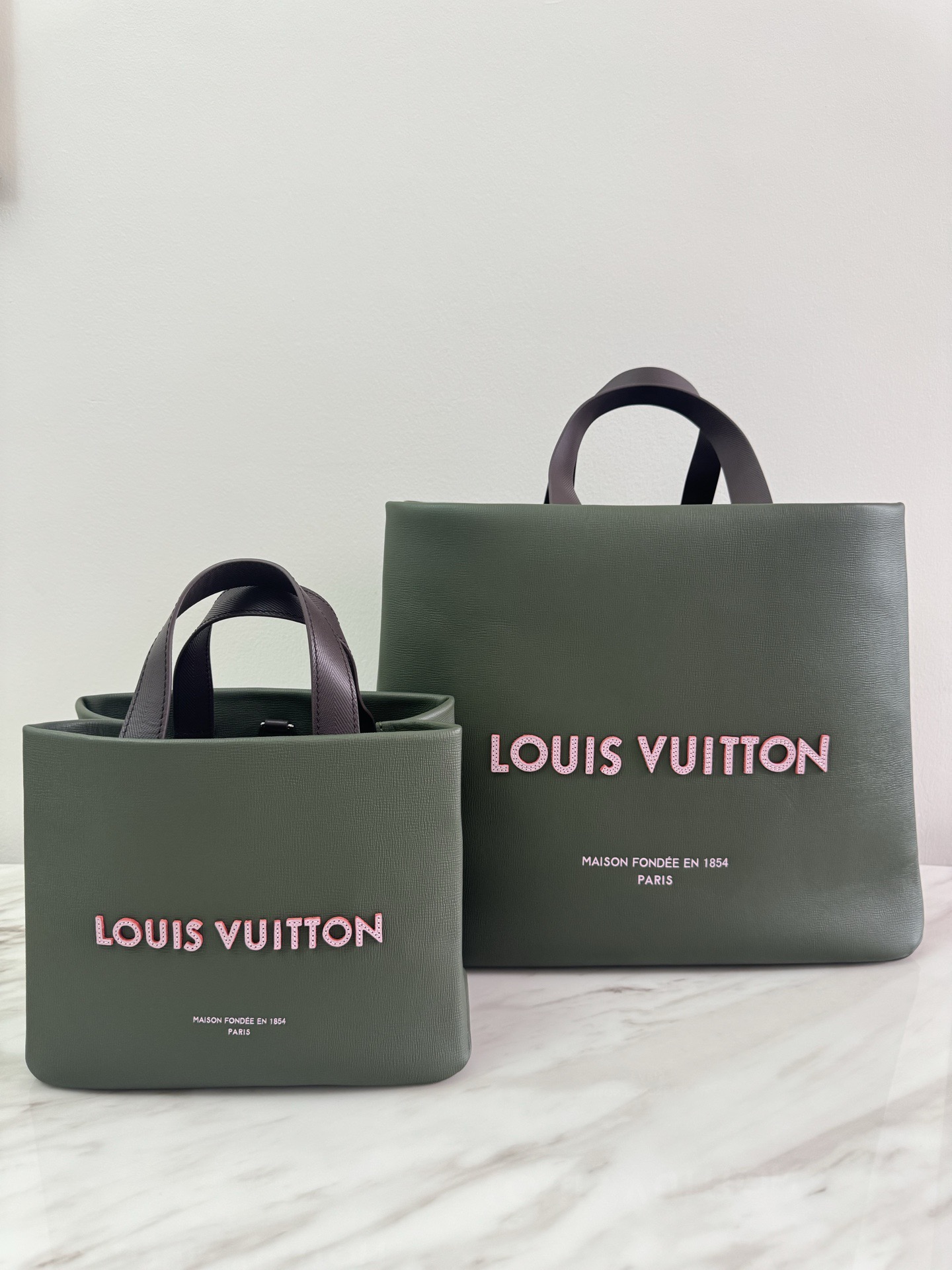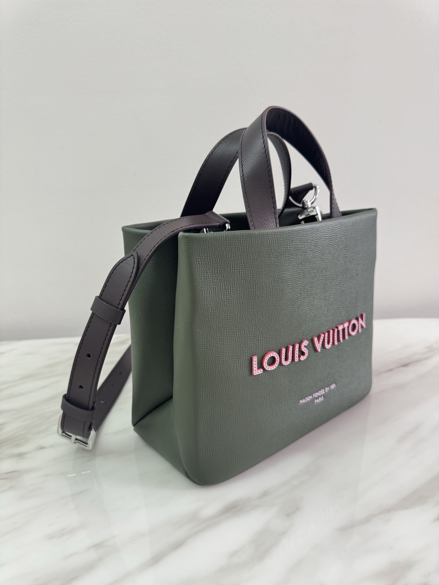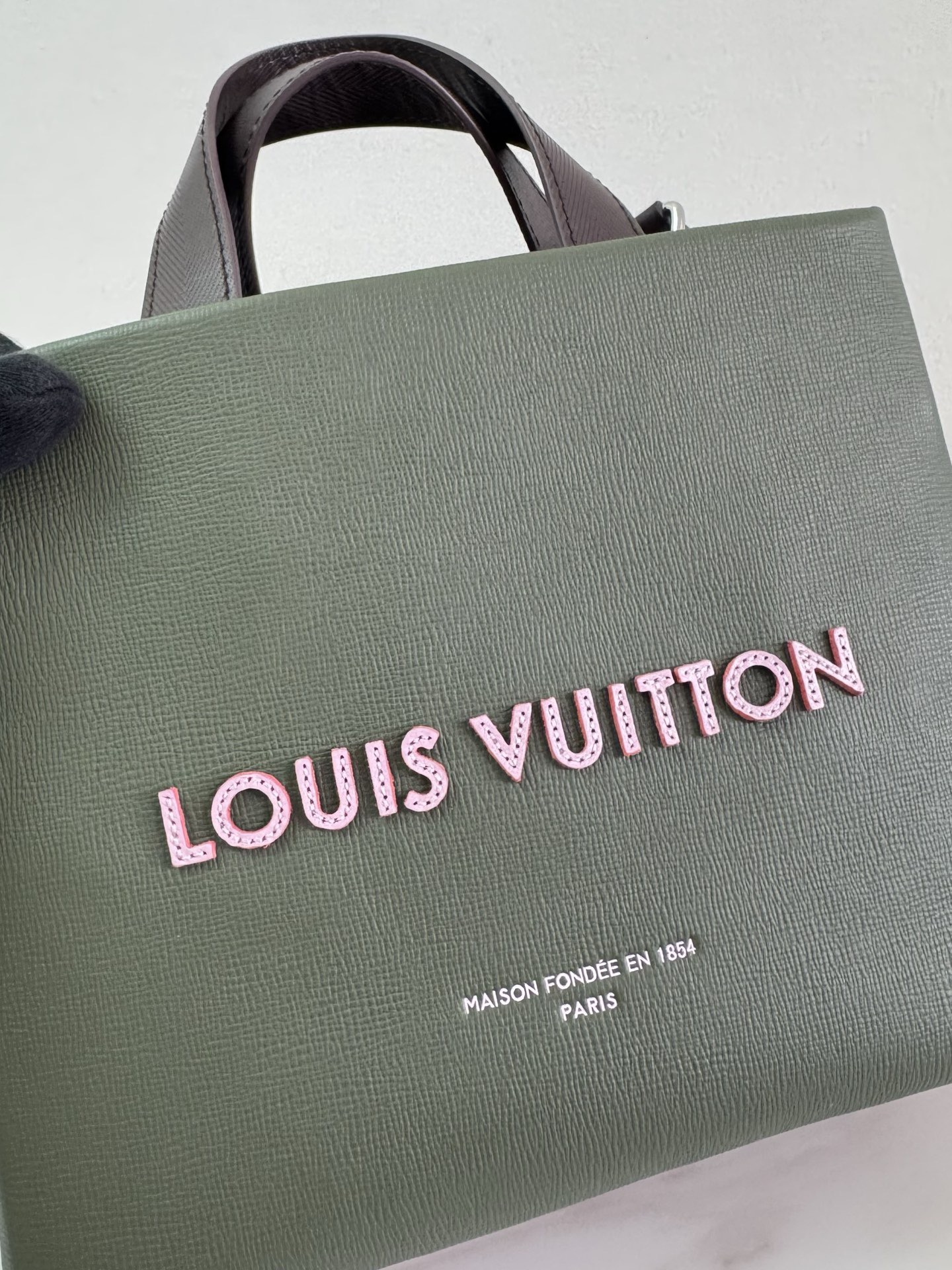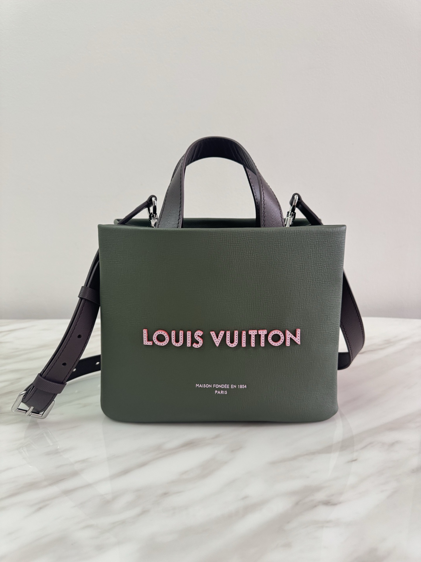 루이비통의 실제 쇼핑백에서 영감을 받아 제작된 가방으로, 가죽 소재에 “Louis Vuitton, Maison Fondée en 1854” 로고가 크게 새겨져 있습니다. 두 개의 탑 핸들과 탈착식 숄더 스트랩이 포함되어 있으며, 카키 그린을 포함한 다양한 컬러로 출시됩니다.
