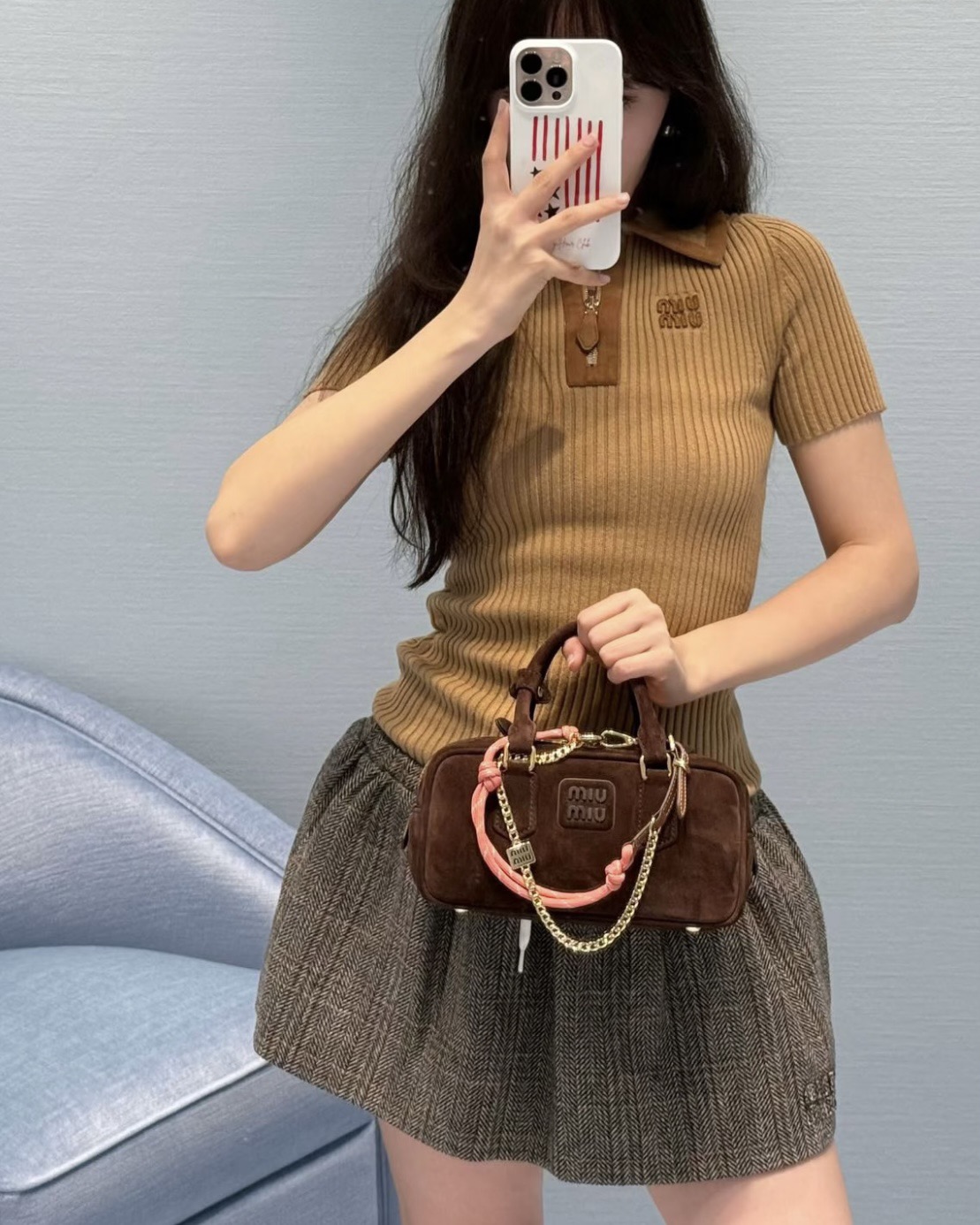 정품 복제품입니다. [신상 신상] 미우미우 골지 니트 캐시미어 혼방 폴로 반팔🌰 스타일, 컬러, 원단까지 완성한 제품. 복제품 역시 캐시미어 스판 실크 혼방으로 통기성이 좋아 여름에 입기 좋습니다. 상체는 답답하지 않고 여성스러운 라인을 자랑하며 심플하지만 디테일이 살아있어요. 브라운 스웨이드백 지퍼 폴로넥 및 자수 로고 커스텀! 시중제품 비교불가 사이즈: 38 40 42