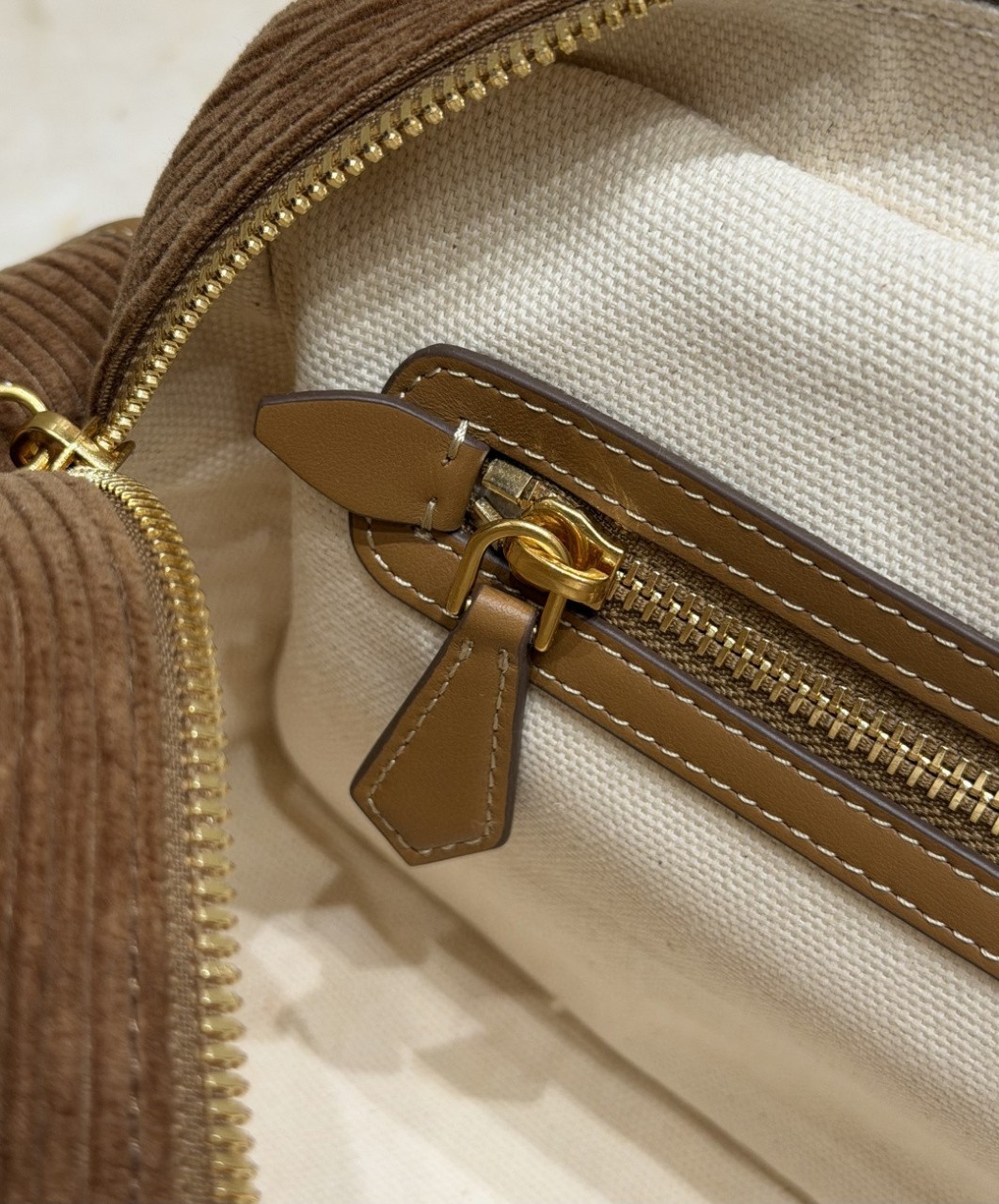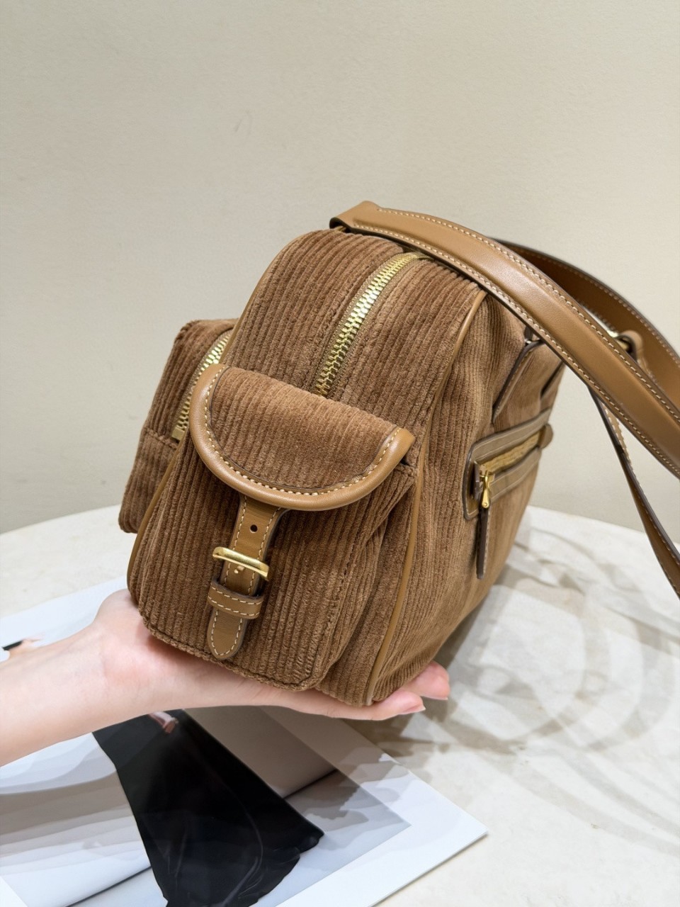 코듀로이 브라운 미우 슬림 포켓 모터백