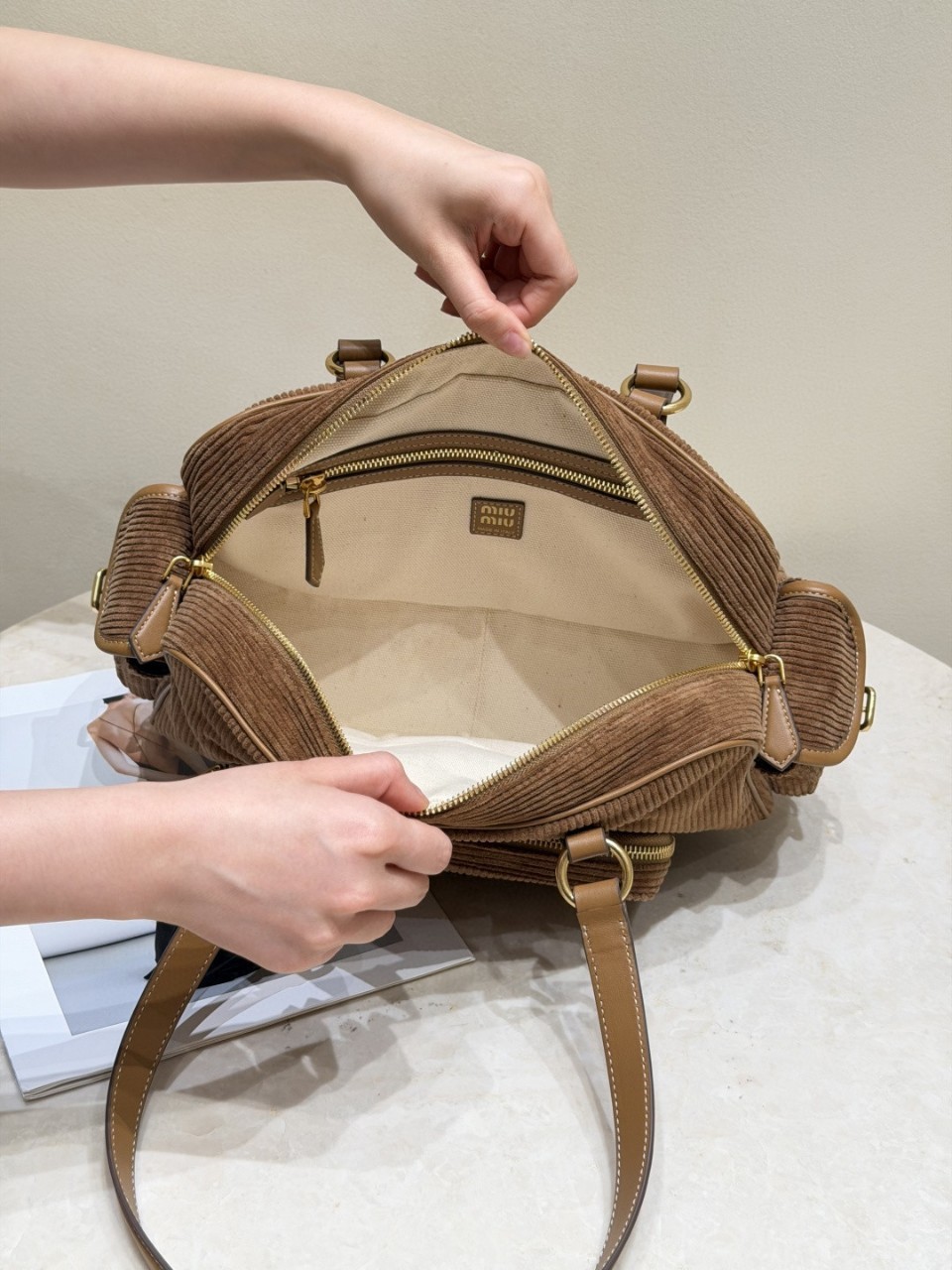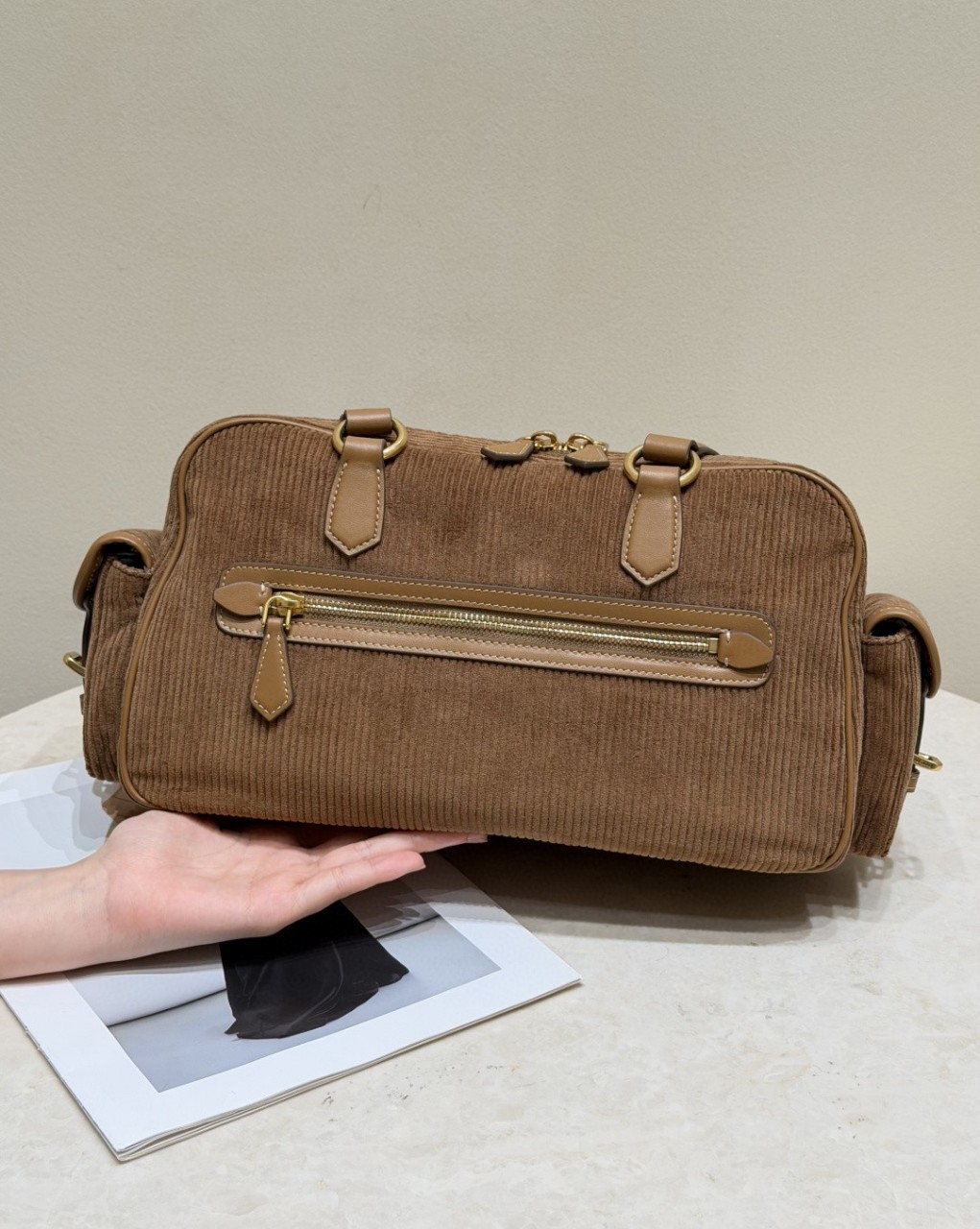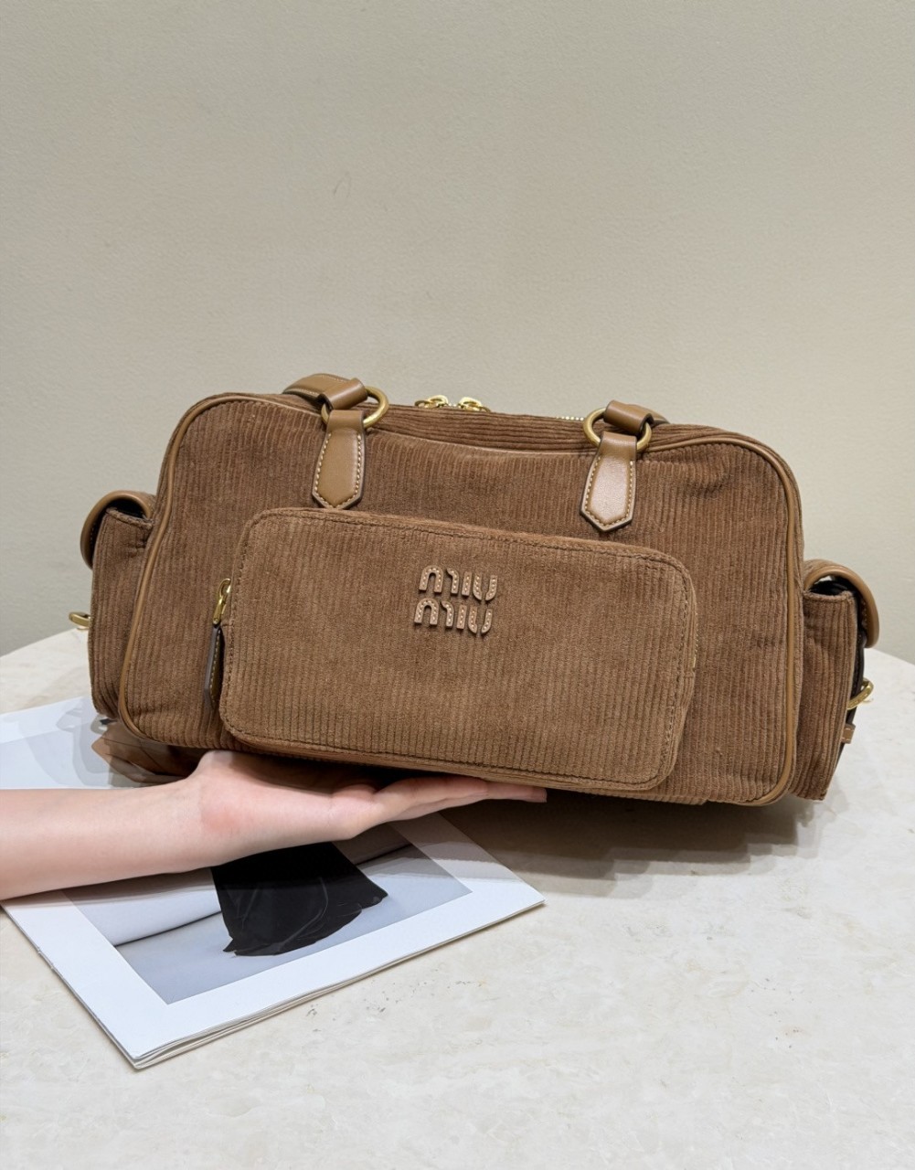 코듀로이 브라운 미우 슬림 포켓 모터백 섬세하고 부드러운 면 안감, 빈티지하면서도 트렌디한 배색, 메고 다니기엔 nice 손에 들고 다니면 정말 멋스러워요. 사이즈 : 34 x 15 x 18cm (핸들높이 41cm) (바닥길이 x 바닥 폭 X 높이) 1380366JDS