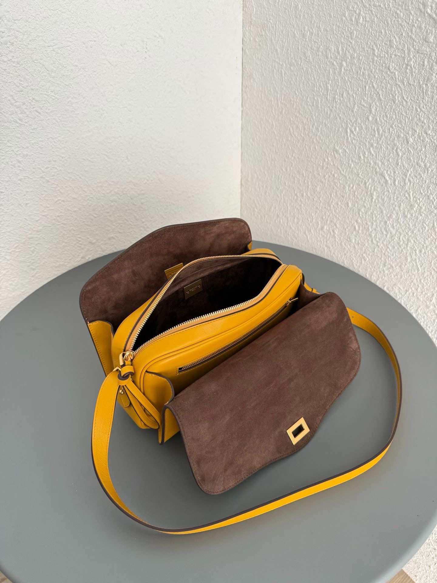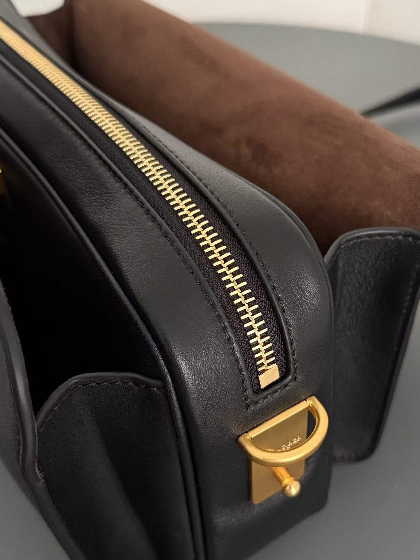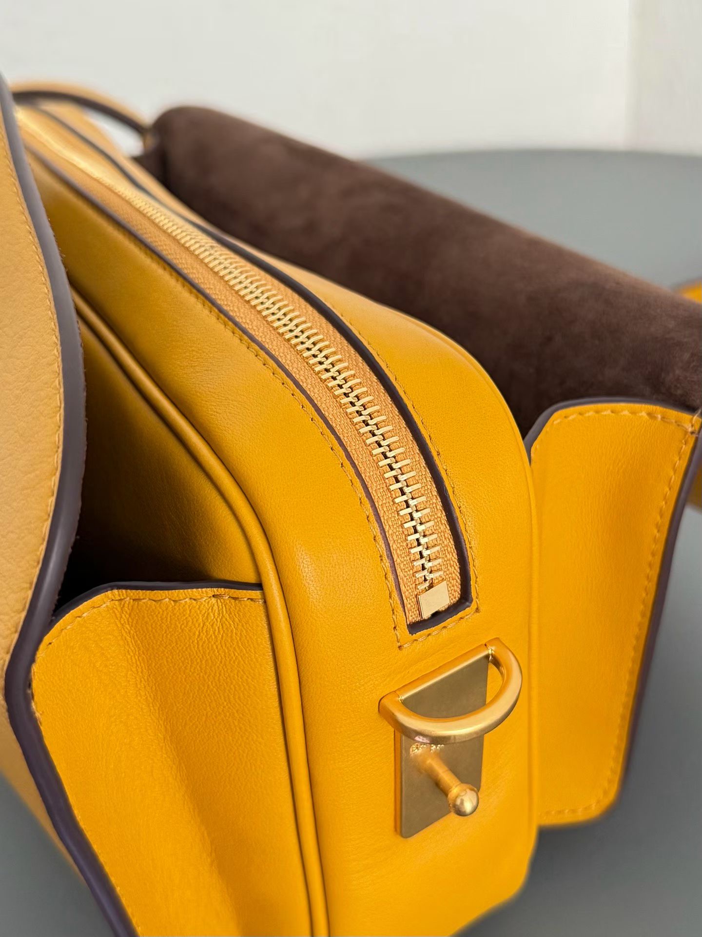 안쪽면은 넛맥 스웨이드 양가죽 안감과 디스트레스 골드 금속 하드웨어로 마무리.