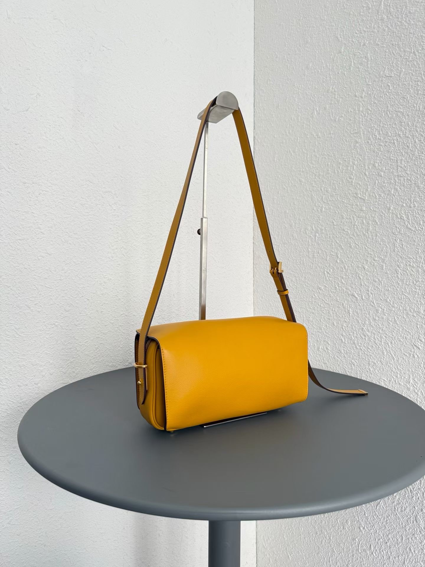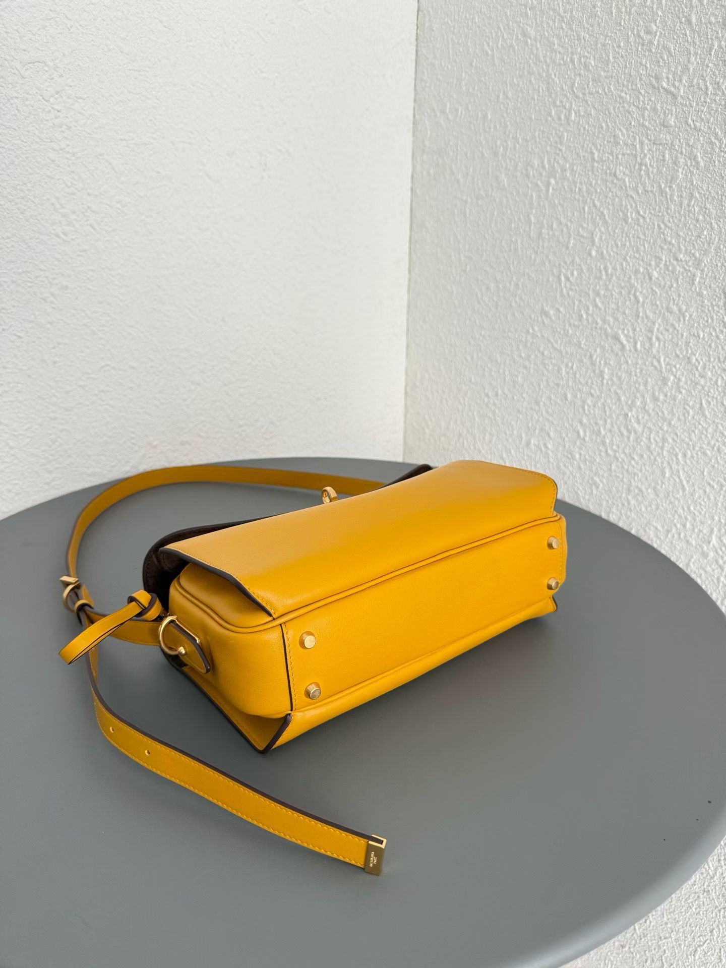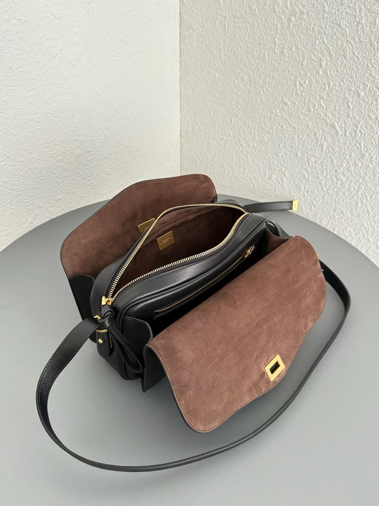 안쪽면은 넛맥 스웨이드 양가죽 안감과 디스트레스 골드 금속 하드웨어로 마무리.