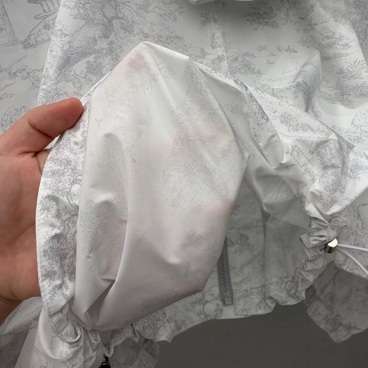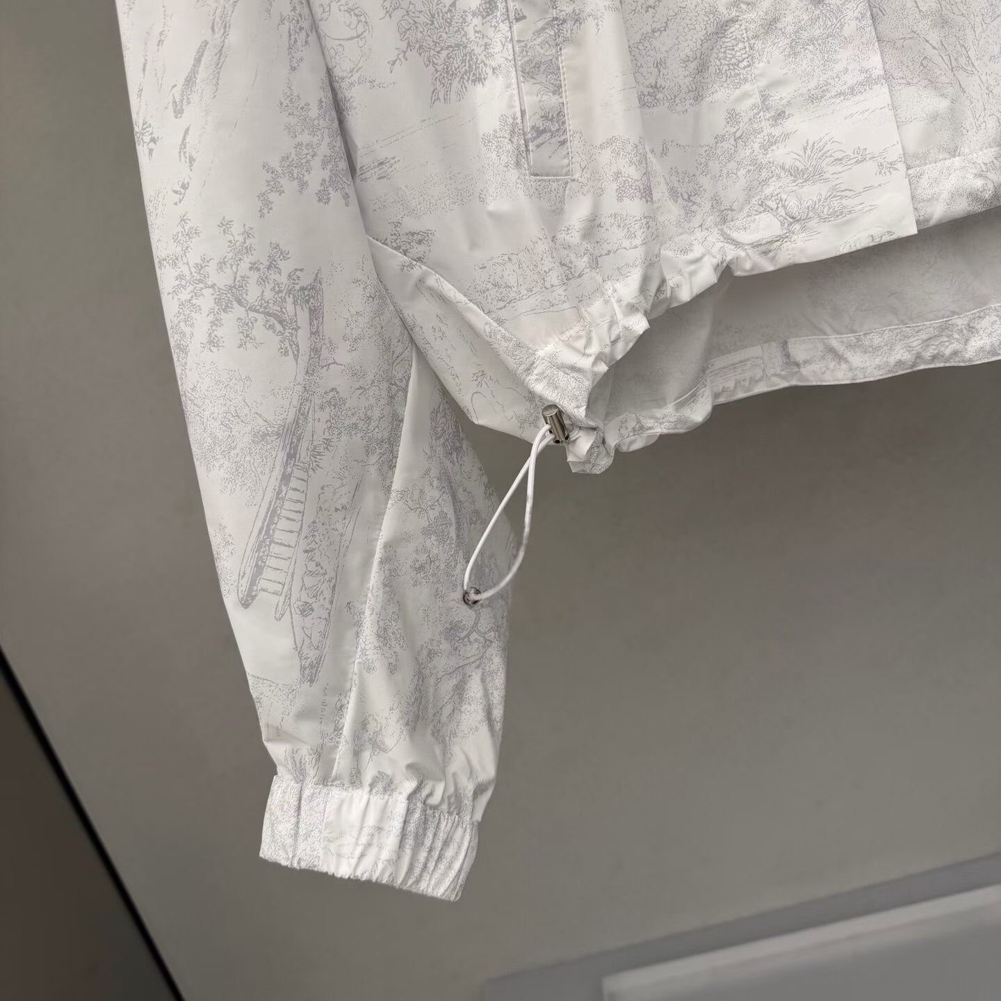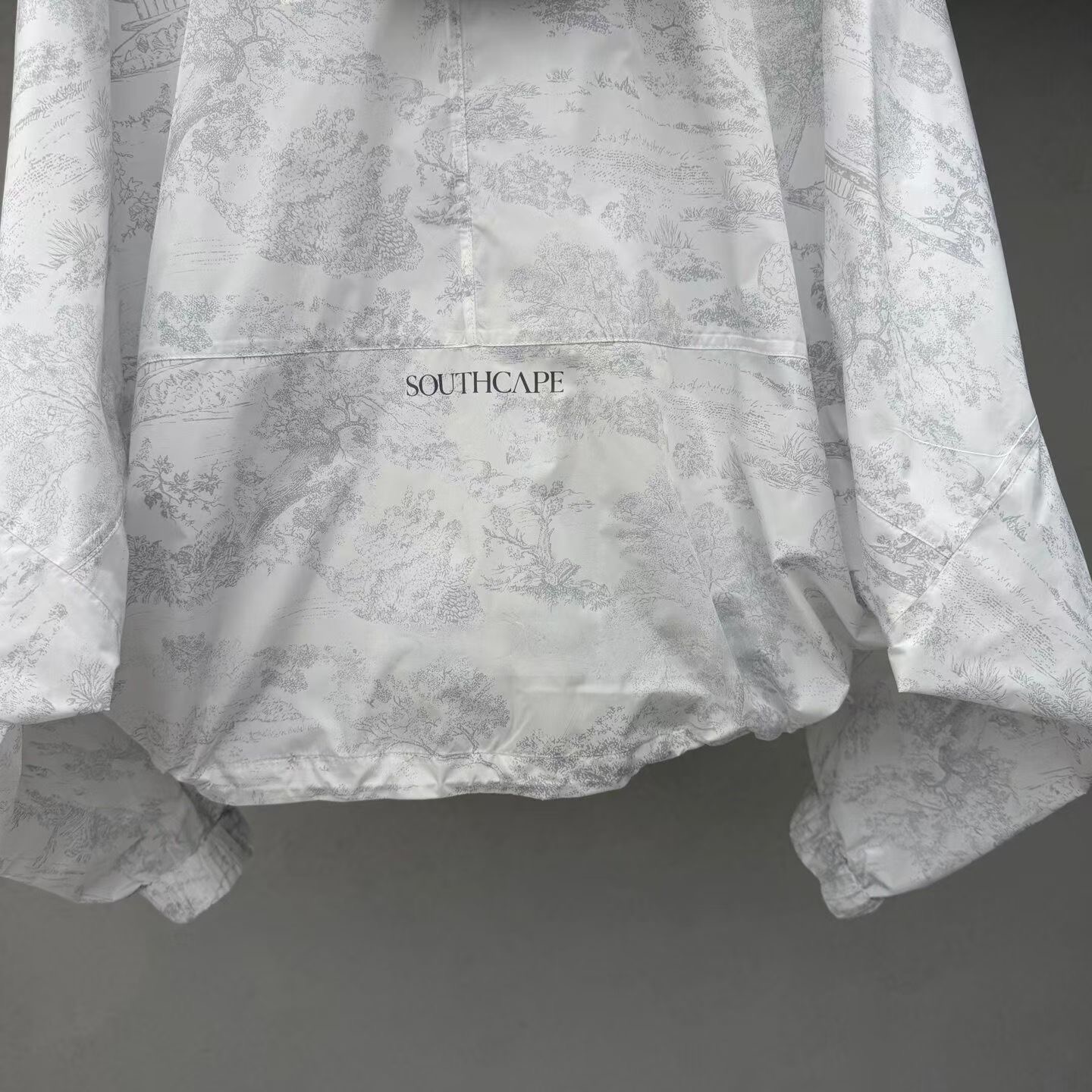 후드 디자인과 양쪽 밑단에 조이는 끈이 있는 스포티한 방풍 프린트 원단!
