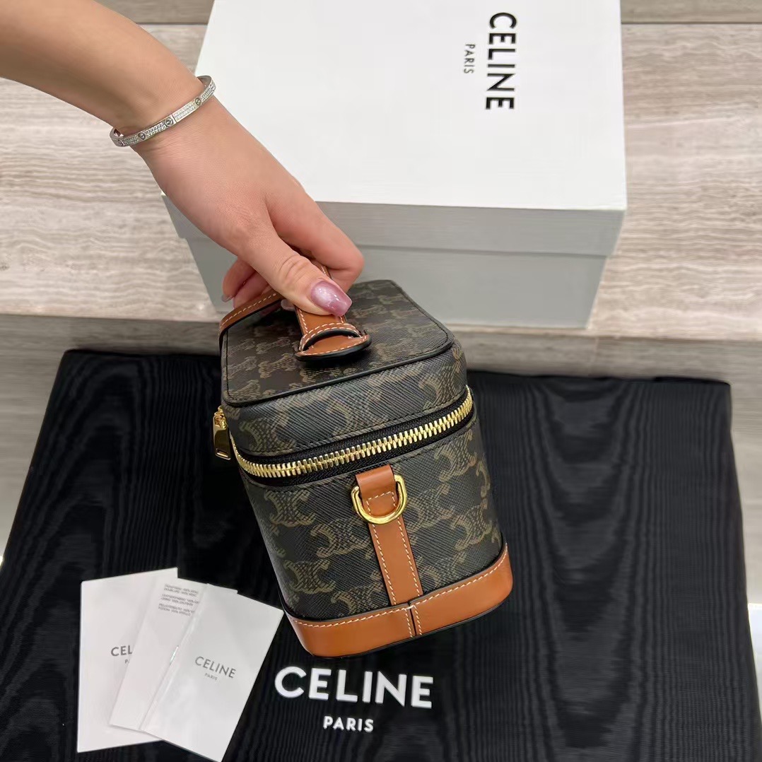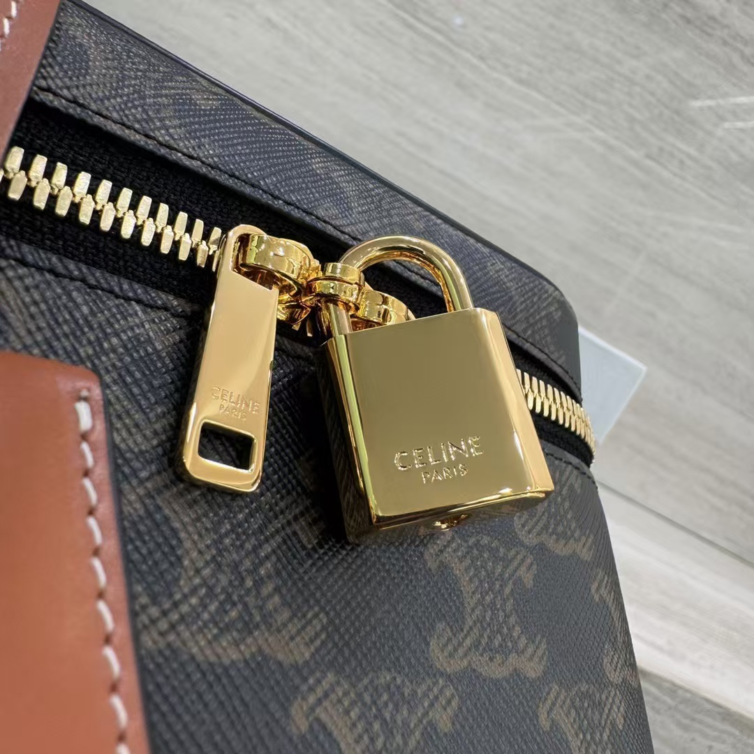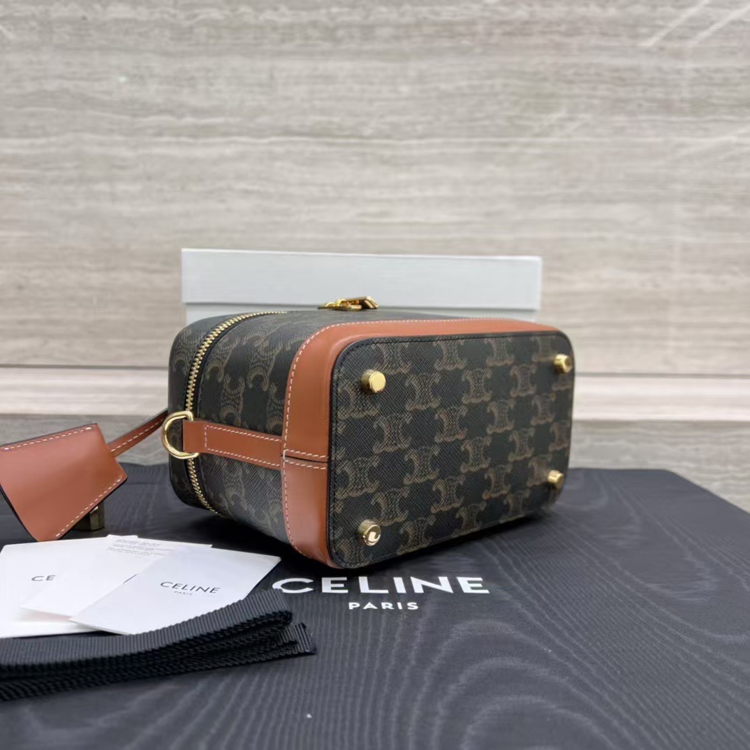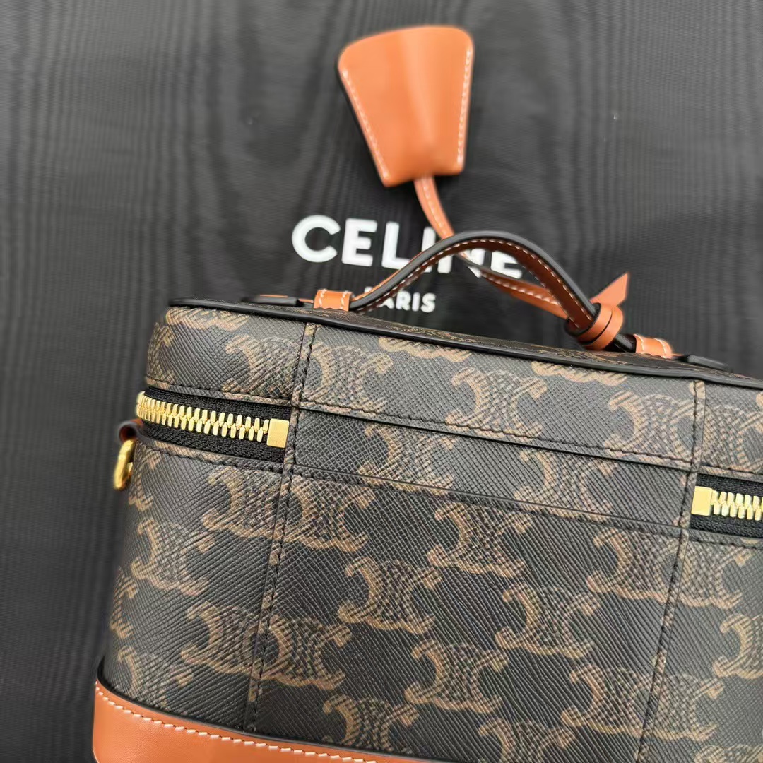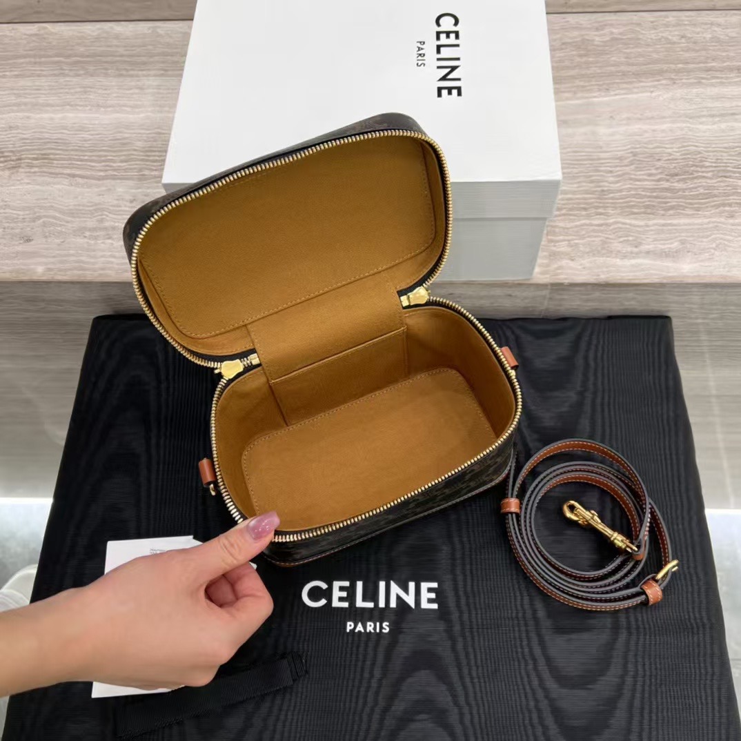 셀린느 트리옹프 베니티 크기: 18×12×18cm 트리옹프 캔버스 로고 프린트, 송아지 가죽 테두리, 금색 마감의 린넨안감 손, 어깨, 크로스바디 더블 지퍼 클로저 메인 수납칸 1개, 바닥스터드 손잡이 길이: 1인치(3cm) 분리 및 조절 가능한 어깨끈(38cm~50cm)