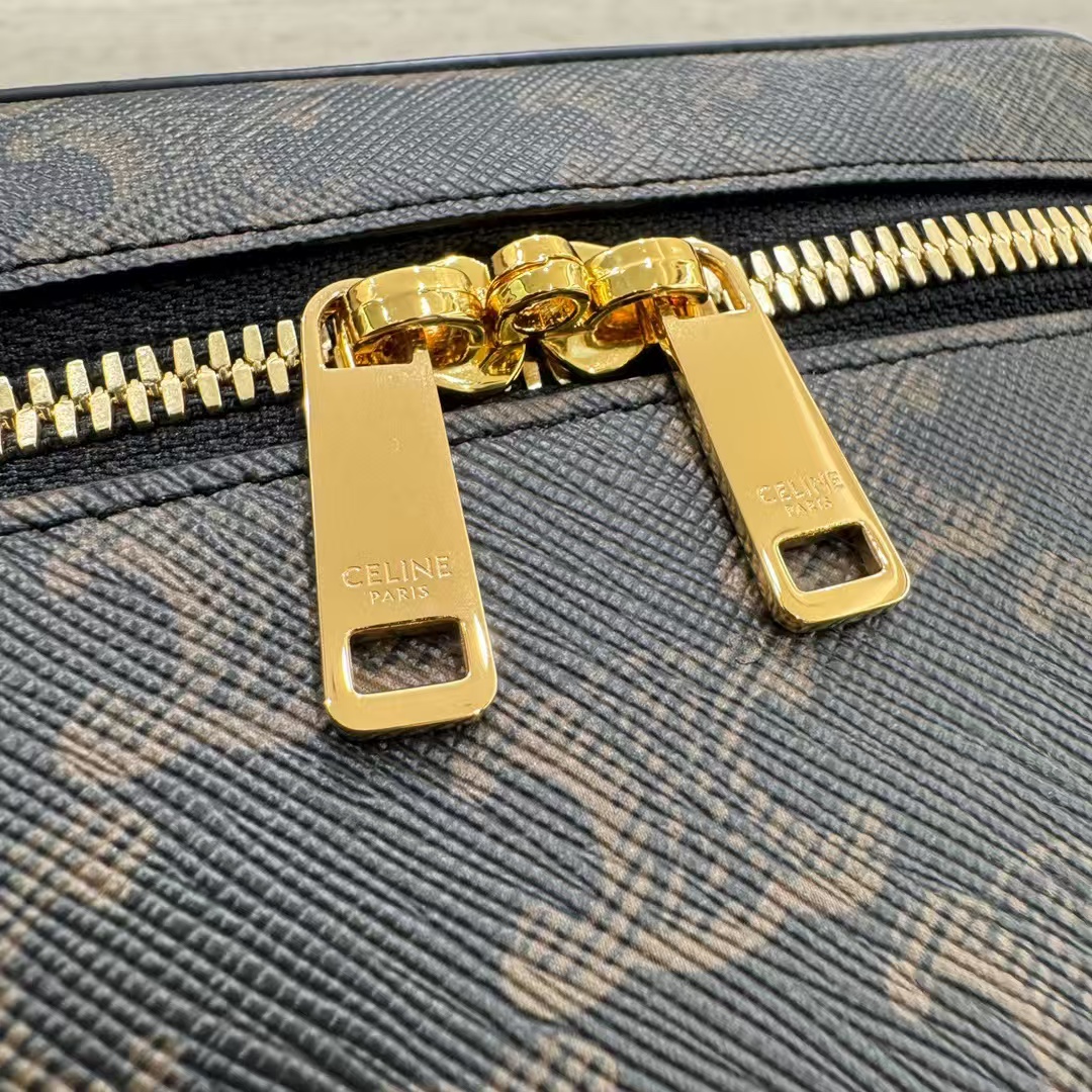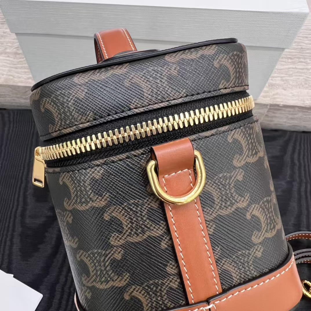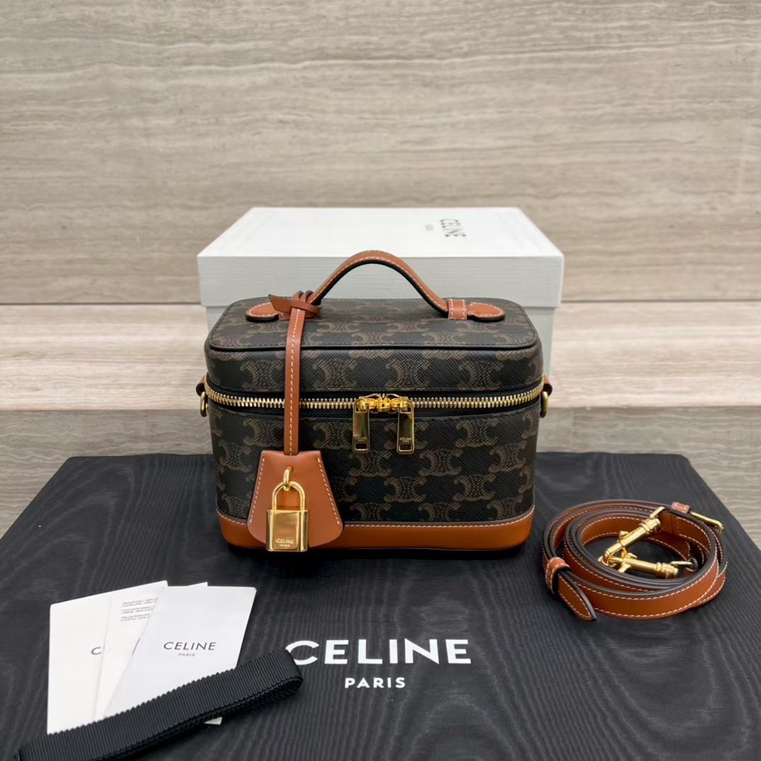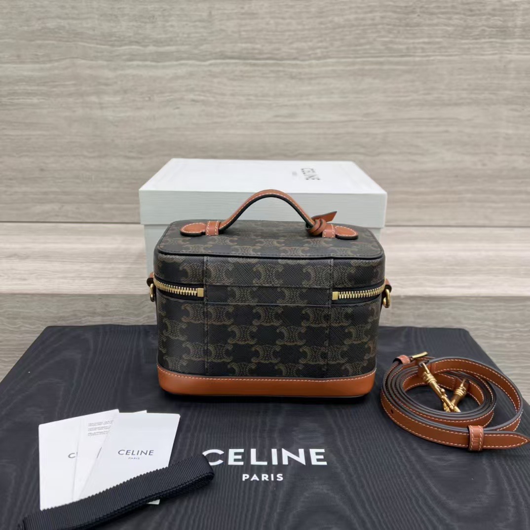 셀린느 트리옹프 베니티 크기: 18×12×18cm 트리옹프 캔버스 로고 프린트, 송아지 가죽 테두리, 금색 마감의 린넨안감 손, 어깨, 크로스바디 더블 지퍼 클로저 메인 수납칸 1개, 바닥스터드 손잡이 길이: 1인치(3cm) 분리 및 조절 가능한 어깨끈(38cm~50cm)
