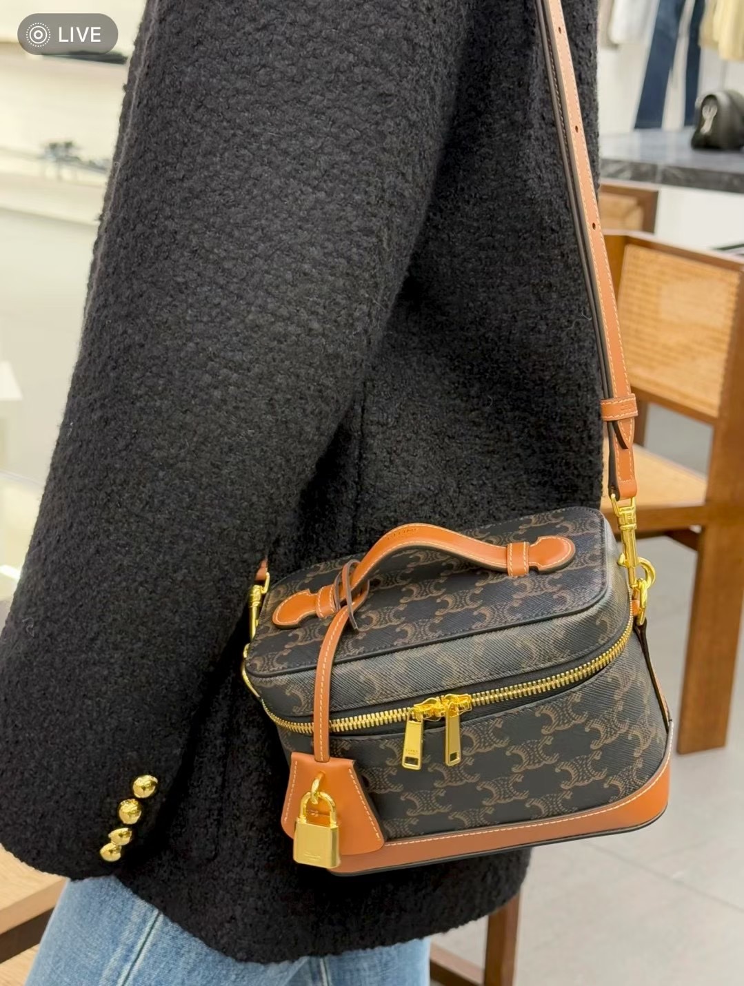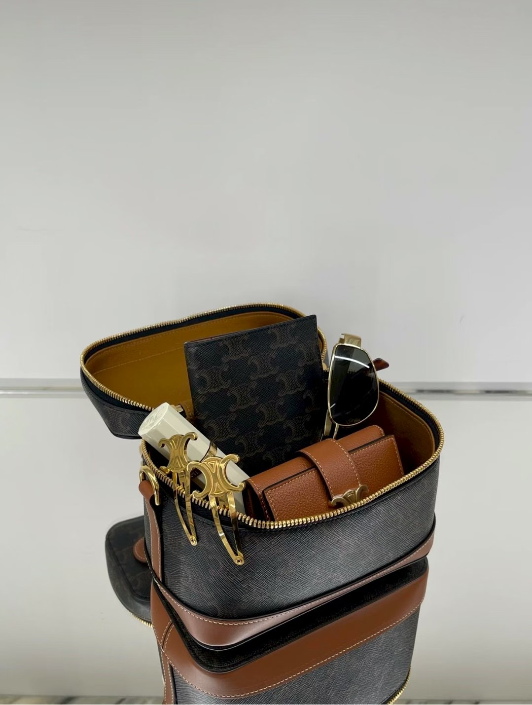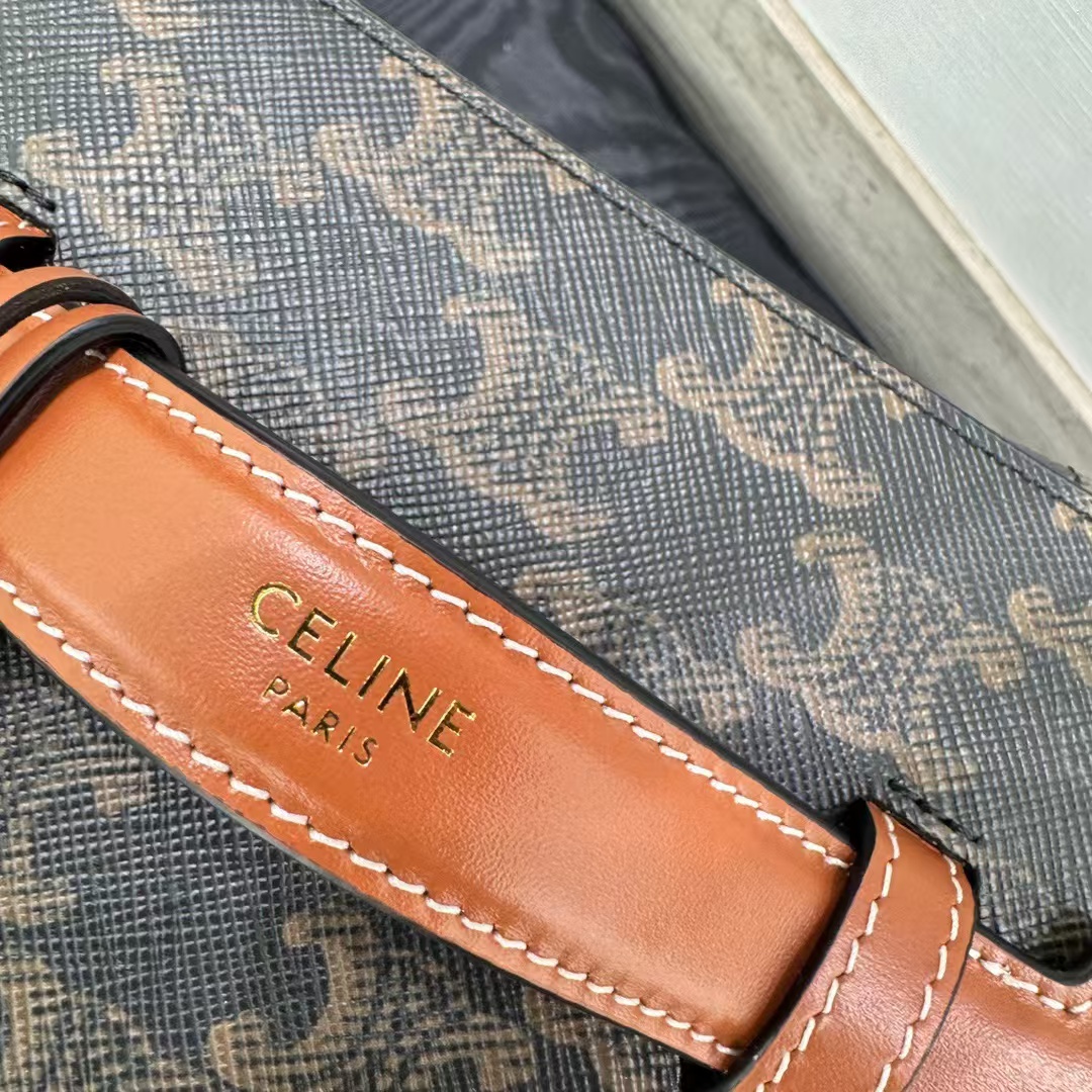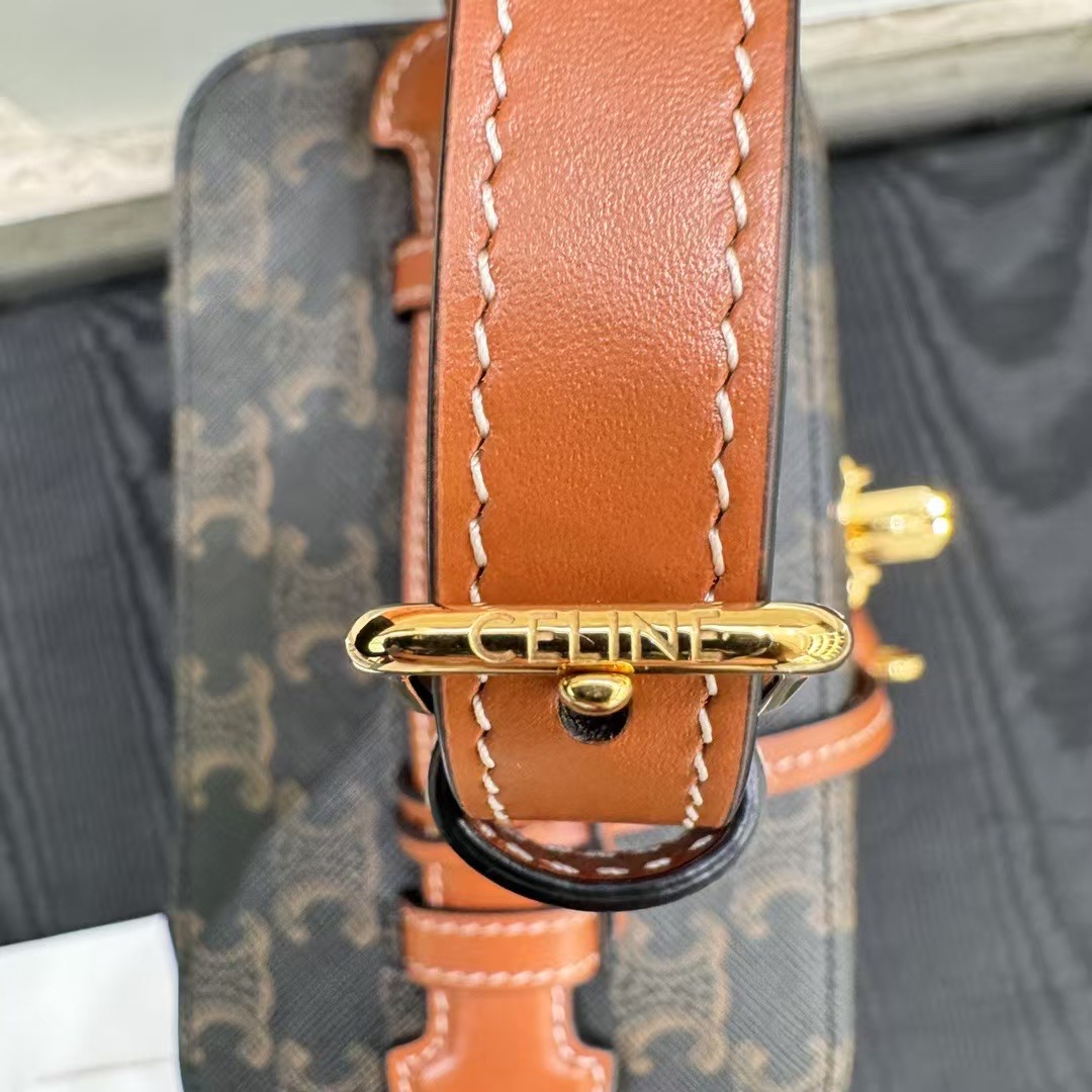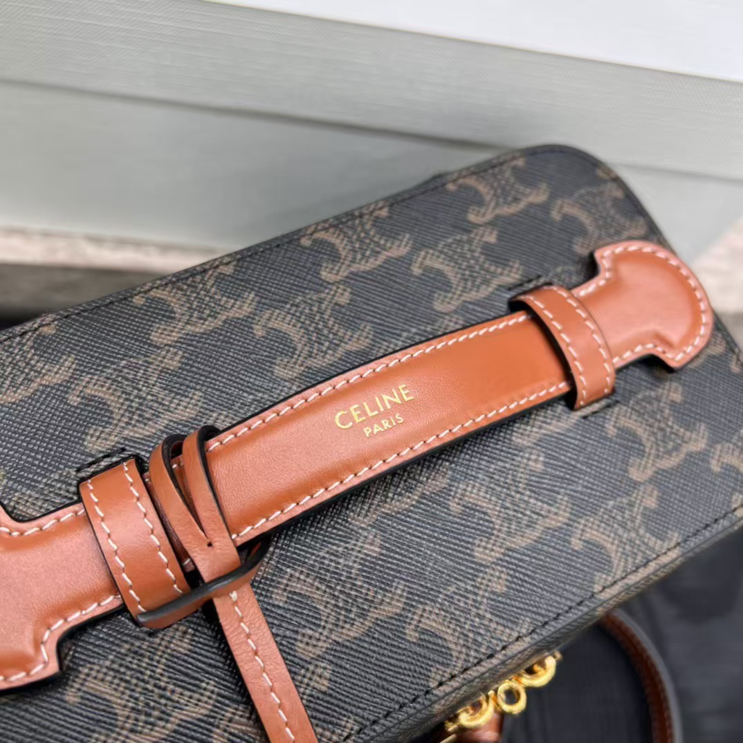 셀린느 트리옹프 베니티 크기: 18×12×18cm 트리옹프 캔버스 로고 프린트, 송아지 가죽 테두리, 금색 마감의 린넨안감 손, 어깨, 크로스바디 더블 지퍼 클로저 메인 수납칸 1개, 바닥스터드 손잡이 길이: 1인치(3cm) 분리 및 조절 가능한 어깨끈(38cm~50cm)