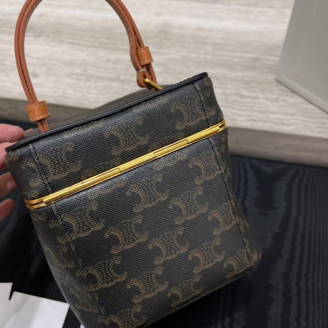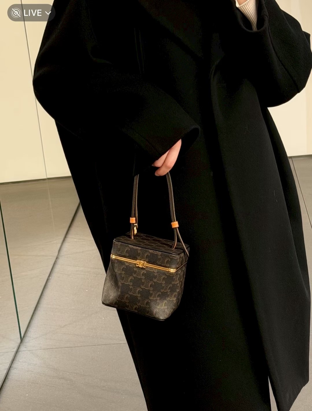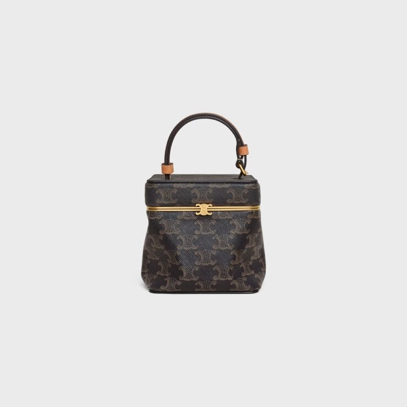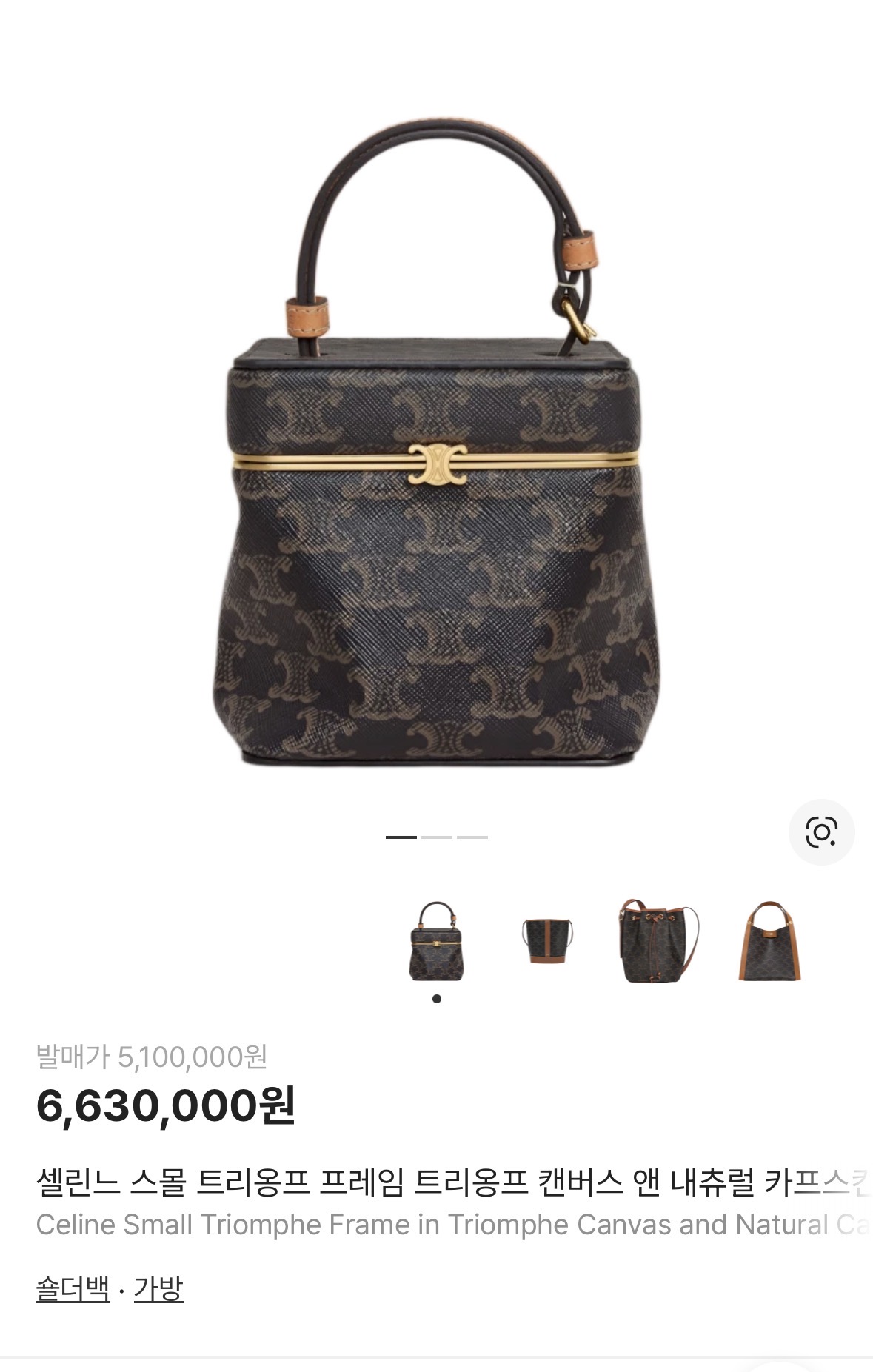 트리옹프 캔버스, 천연 송아지 가죽 트리밍 양가죽 안감 골드 마감 핸드 캐리, 엘보 캐리, 숄더 캐리 메인 수납공간 1개 이너 미러 1개 사이즈 : 가로12.5 x 세로12.5 x 높이12.5cm 최소 17cm, 최대 31cm 높이 조절 가능한 스트랩
