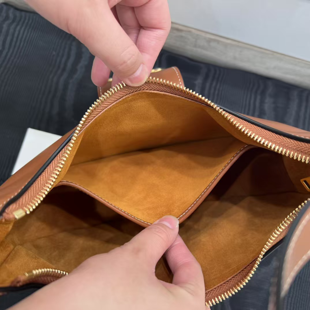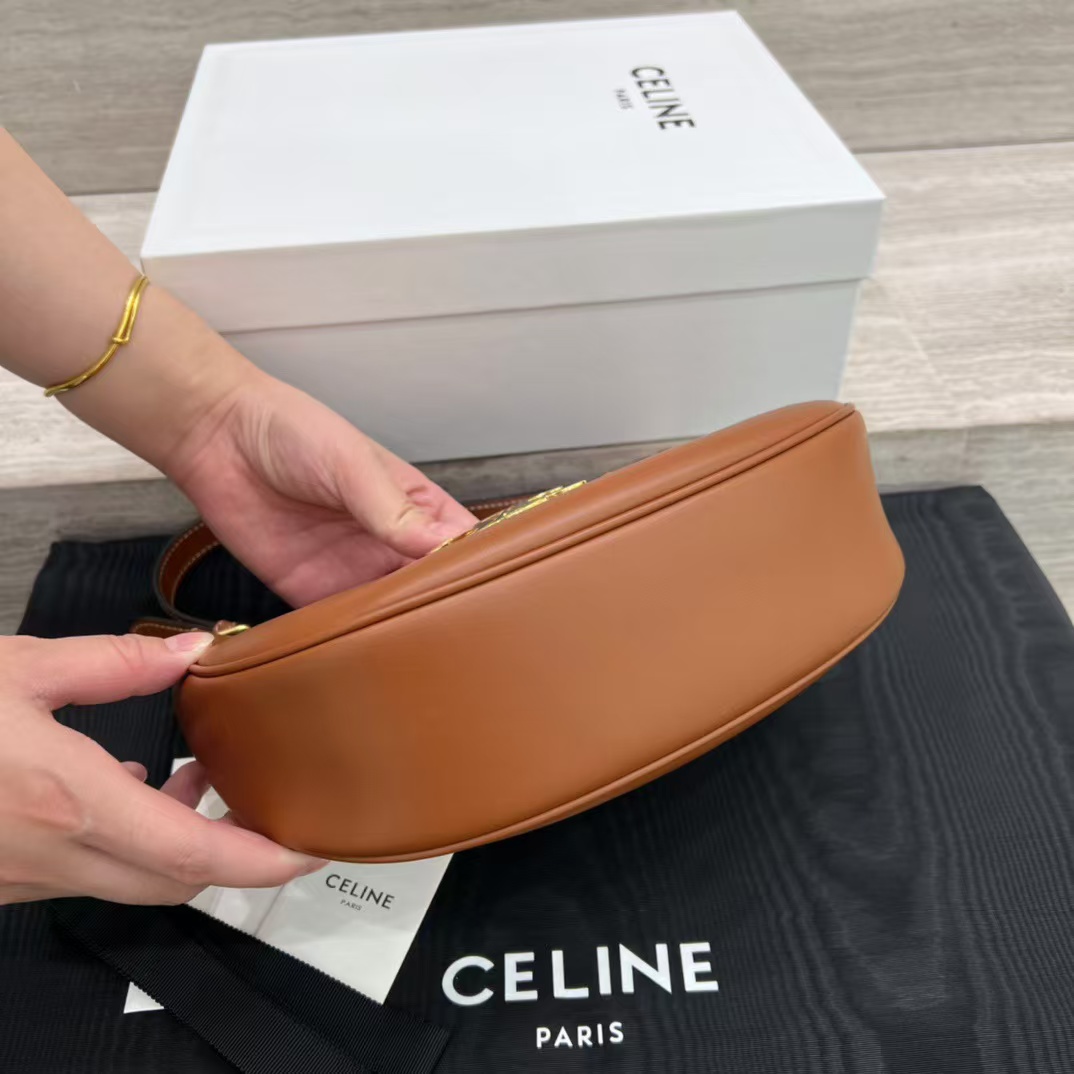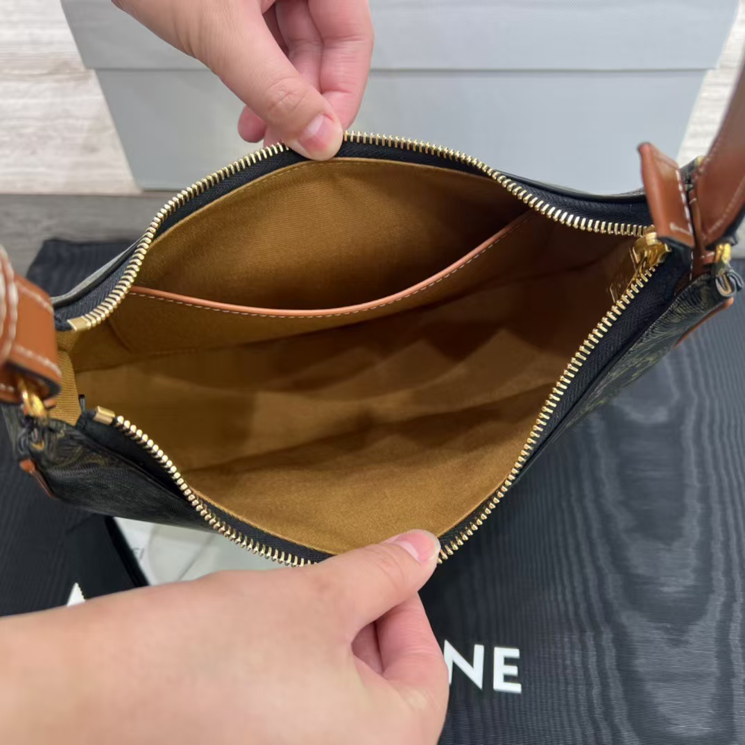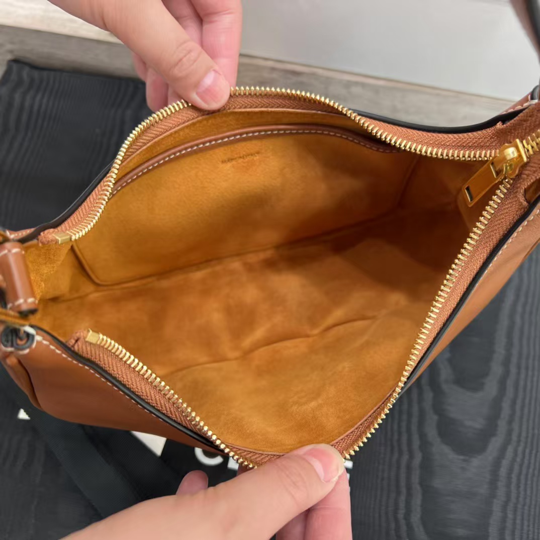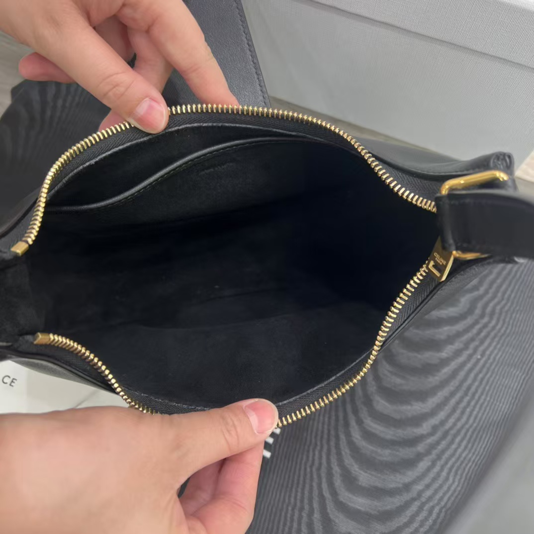 AVA 송아지 가죽으로 된 호보백 크기: 23×13.5x6cm 색상: 탄, 블랙, 트리옹프 카우하이드, 안감: 소가죽 + 원단 금장. 어깨와 손 들고 마그네틱 클로저와 지퍼로 더블 클로징 1개의 내부 포켓 스트랩 : 최소 길이 22cm, 최대 길이 23cm