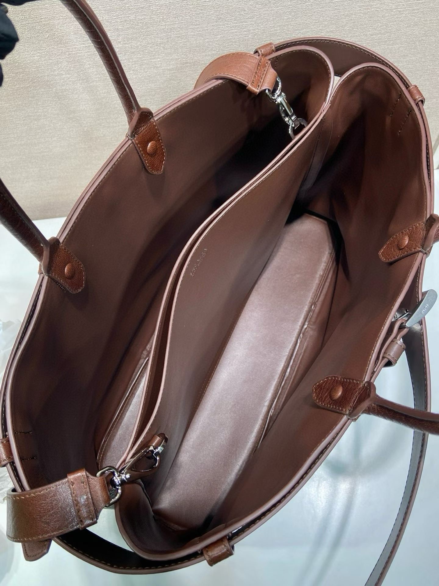 버클이 달린 탈부착이 가능한 맞춤 조절형 가죽 숄더 스트랩 최대 길이 110cm – 최소 길이 100cm – 최대 드롭 길이 53cm – 최소 드롭 길이 48cm